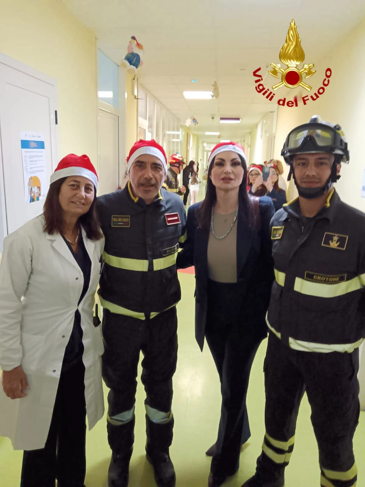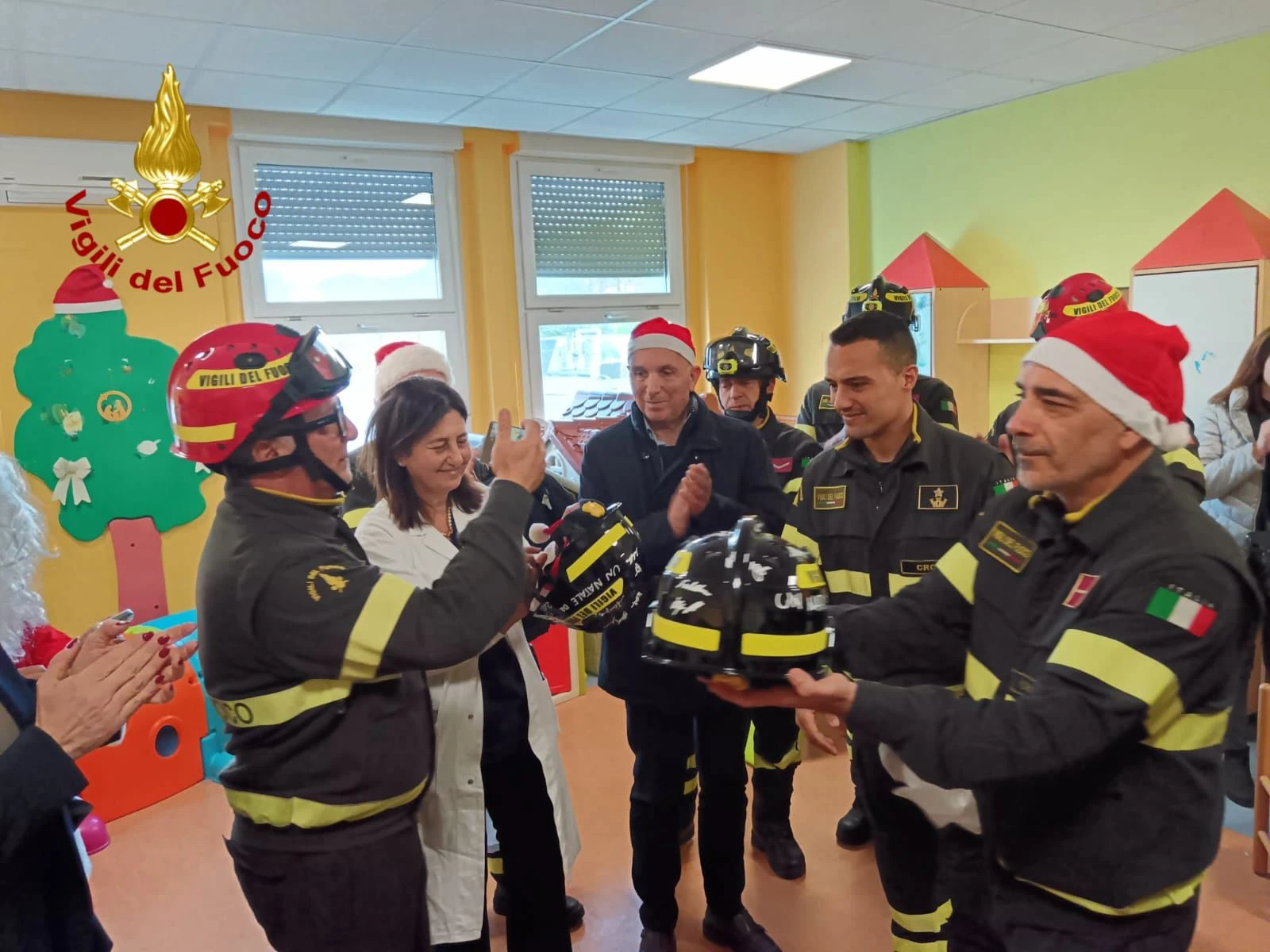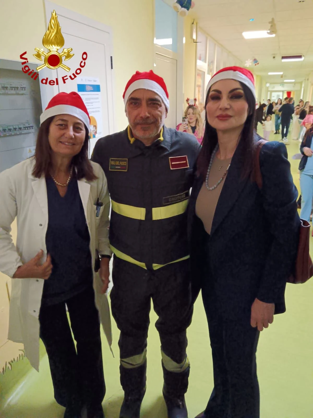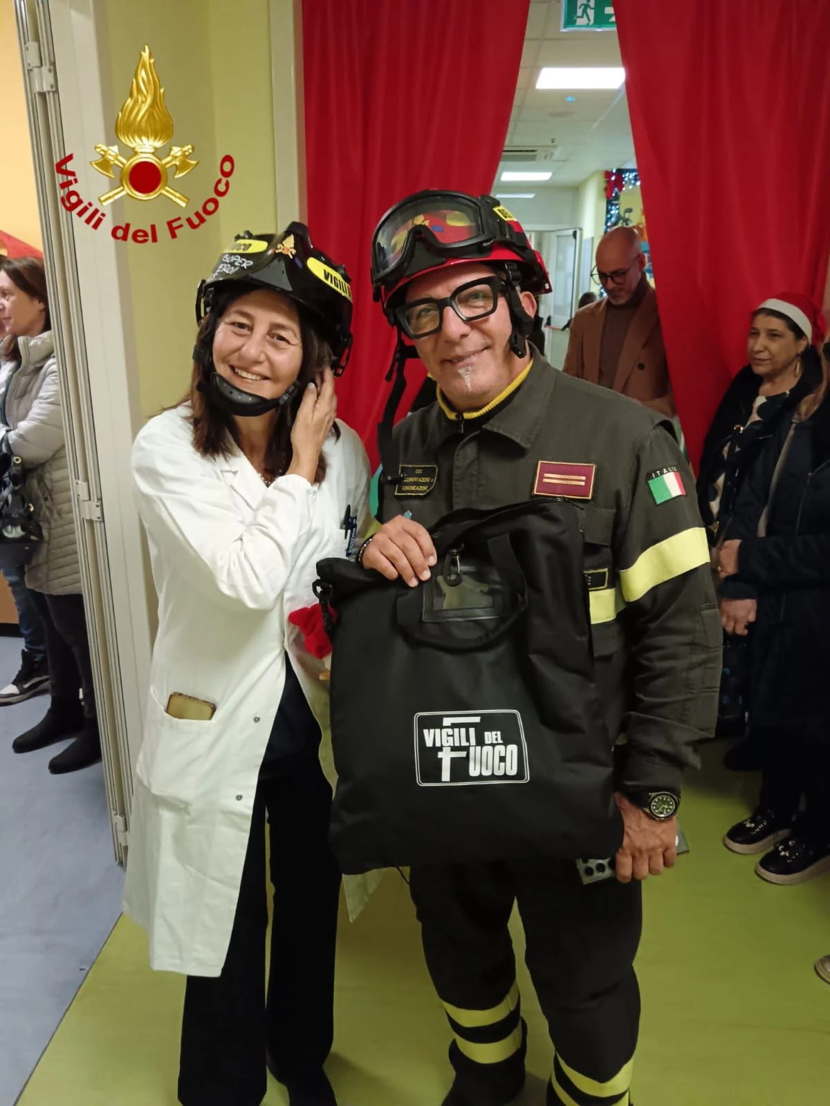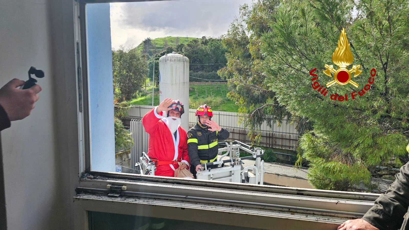 I Vigili del fuoco, giunti nel reparto da una finestra con l’ausilio dell’autoscala, hanno donato un momento gioia in un periodo speciale dell’anno ai piccoli degenti del reparto del Primario Dott.ssa Stefania Zampogna.