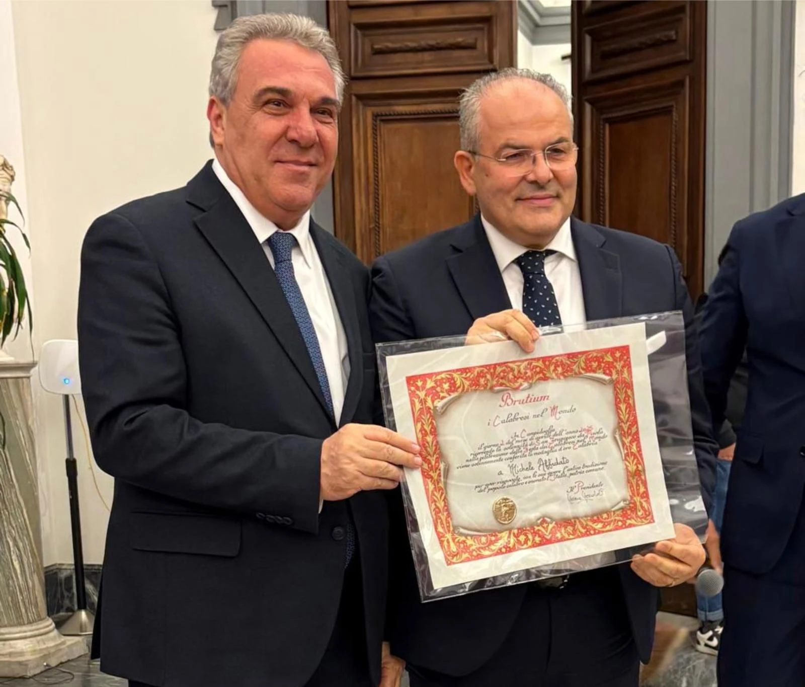 Nel corso della cerimonia, condotta da Domenico Gareri, è stata conferita a Michele Affidato la Medaglia d’Oro Calabria 2025, prestigioso riconoscimento assegnato dal Comitato Direttivo del Brutium a personalità che, attraverso il proprio percorso umano, professionale e culturale, hanno contribuito a dare lustro alla Calabria in ambito nazionale e internazionale.