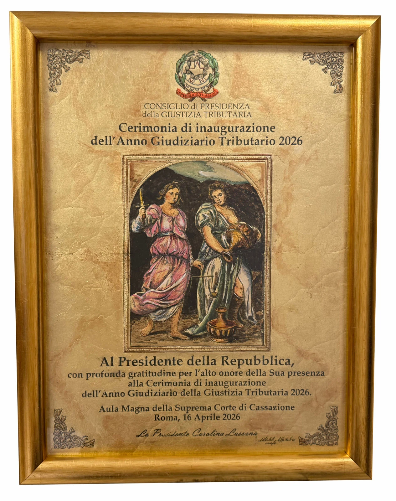 A suggello della cerimonia, la Presidente Carolina Lussana ha consegnato al Presidente della Repubblica un bassorilievo in argento realizzato dal Maestro orafo Michele Affidato: un’opera concepita come simbolo tangibile del valore della giustizia e della responsabilità istituzionale. L’opera, ispirata a un dipinto di Bonifacio Veronese, raffigura le allegorie della Giustizia e della Temperanza: la figura a sinistra rappresenta la Giustizia con la spada, mentre quella a destra raffigura la Temperanza nell’atto di versare acqua da un vaso.
