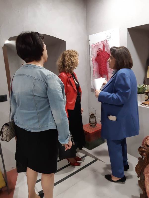 Rosa Spina ha saputo affascinare i presenti col racconto di una vita pervasa dall’amore per la tessitura, arricchita da incontri con personaggi illustri del mondo dell’arte e non solo, come quello con il maestro Mimmo Rotella, il quale da subito ha riconosciuto il suo talento, incoraggiandola a coltivarlo. Oggi la Spina è riconosciuta dalla critica come “l’espressione somma della Fiber Art”, corrente d’arte contemporanea affermatasi negli anni ’60 negli USA e nel nord Europa, alla quale l’artista si accosta con grande originalità dando vita alla personalissima tecnica del Défilage, che consiste nella manipolazione dei tessuti, realizzati al telaio dall’artista e successivamente applicati alle opere pittoriche ed alle istallazioni, ottenendo così una serie infinita di effetti dovuti alla loro lacerazione e scomposizione.