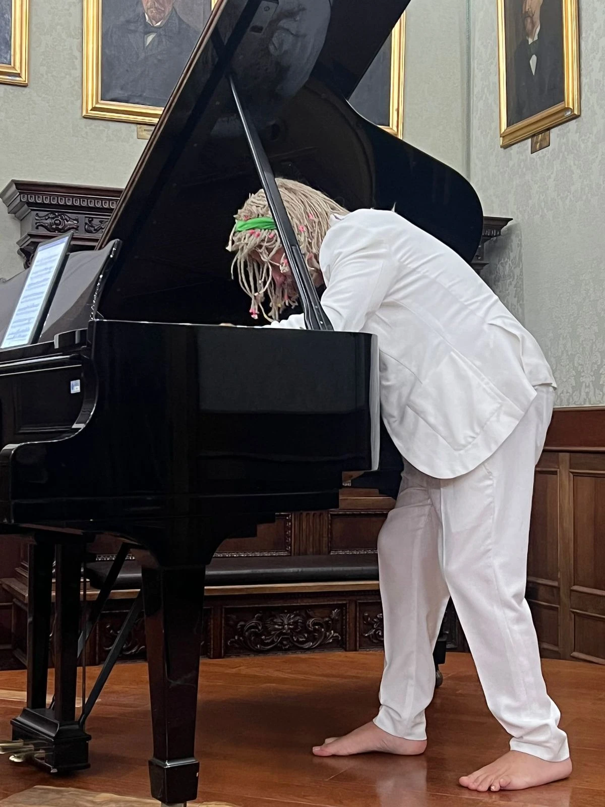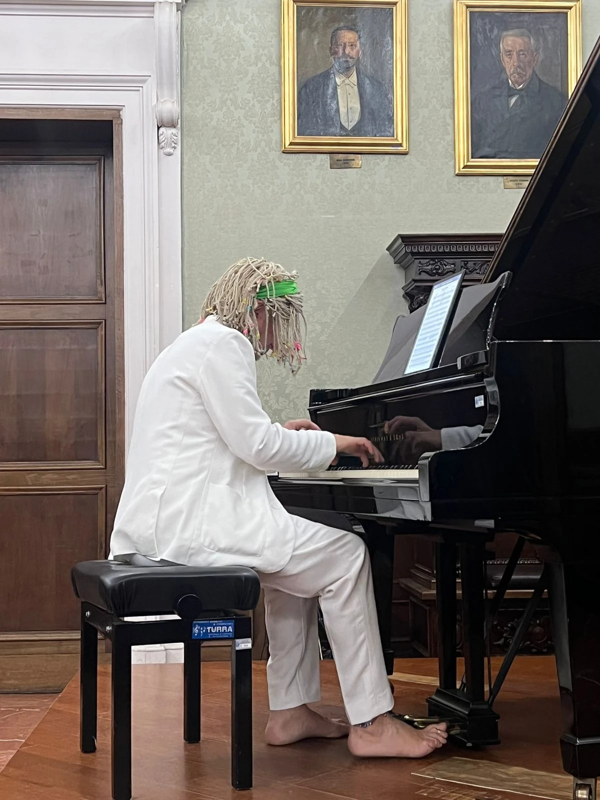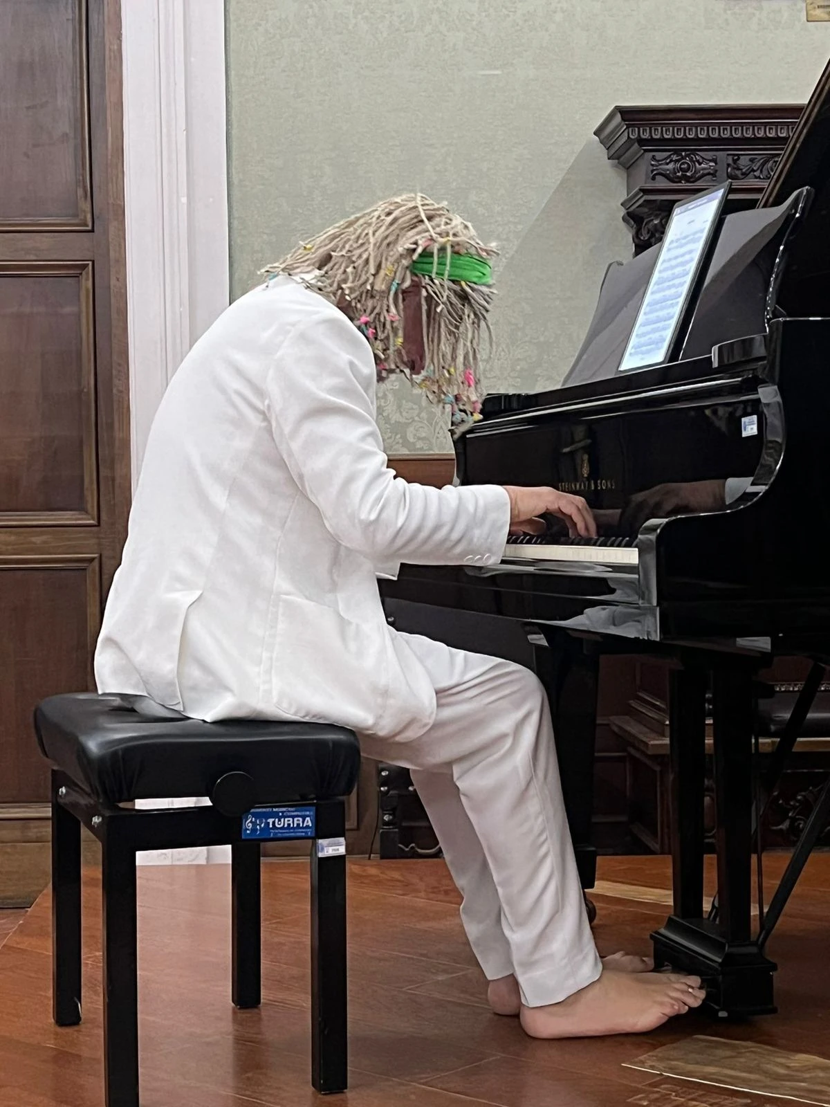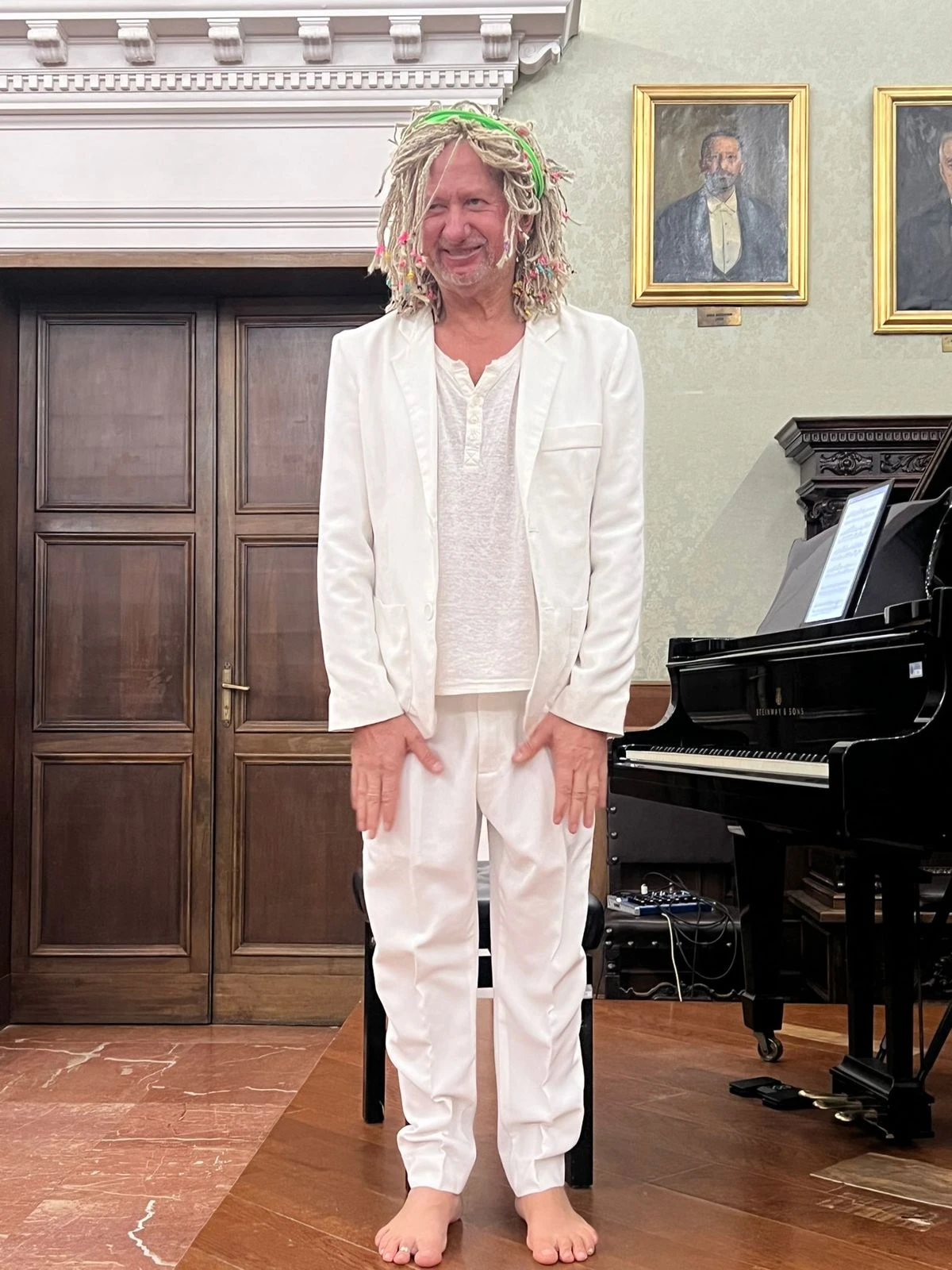 Abito bianco e t-shirt bianca, folta capigliatura acconciata con treccine fermate da piccoli nastri fucsia, gialli, verdi, punti di colore tra la massa bionda tenuta a bada da una bella fascia verde mela, e poi …il clou … Maurizio siede al pianoforte e inizia a suonare, così come si è presentato, a piedi nudi, con anello al dito del piede e cavigliera. Certamente, dunque, è un personaggio!