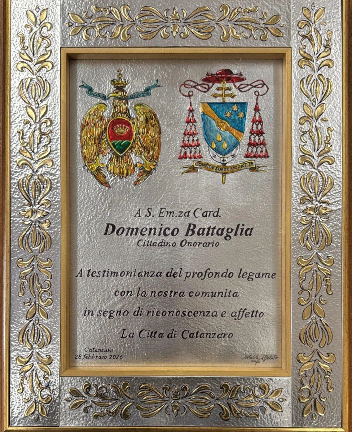 Sul termine del suo discorso, arriva una dichiarazione d'intenti: "Mi piacerebbe che questa cittadinanza onoraria diventasse, per me, davvero una cittadinanza operativa. Il rischio più grande è che gli ultimi diventino un tema: loro sono persone che vanno incontrate, ascoltate, aiutate. Vi chiedo di aiutarmi a rimanere fedele al mio essere prete degli ultimi: è questo il mio impegno pubblico. E se un giorno qualcuno dirà È stato cittadino di Catanzaro, io vorrei che si potesse aggiungere senza retorica, con naturalezza È rimasto un prete degli ultimi". Il momento, con molta pacatezza, è stato dedicato al piccolo Domenico. Una standing ovation ha accompagnato poi la firma dei documenti per la cittadinanza onoraria, corredati dal dono di una targa celebrativa realizzata da Michele Affidato. Catanzaro, dunque, riabbraccia il "suo" cardinale. Non sarà però l'unica città in Calabria a tributare di una simile onoreficienza Sua Eminenza: martedì 3 marzo, infatti, anche Squillace accoglierà Don Mimmo Battaglia per conferirgli lo stesso status, con una cerimonia che si terrà alle 11 nella Basilica "S. Maria Assunta".