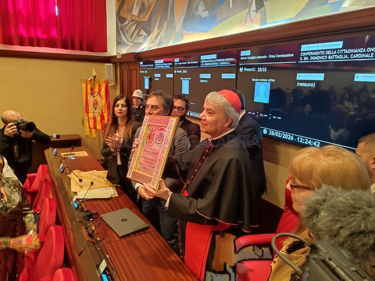 Dopo un lungo applauso, la parola è passata al Sindaco Fiorita: "Ci sono riconoscimenti che servono a dare prestigio. E ce ne sono altri che servono a dare senso. Lei non è qui perché è Cardinale ma perché ha scelto subito da che parte stare, immergendosi nell’umanità di un luogo che anche grazie a lei è diventato comunità. Per oltre vent’anni ha guidato il Centro calabrese di Solidarietà. Non un incarico, ma una responsabilità diventata missione di vita nel segno di un Vangelo non predicato: senza parole, senza slogan, ma cercando la sofferenza e l’amore nei volti e nelle storie, specie quelle dimenticate. Quando Papa Francesco l’ha chiamata a Napoli e poi l’ha voluta Cardinale, lei non ha cambiato linguaggio, postura o tono: ha continuato a dire che la pace non si costruisce armando i popoli, ma disarmando i cuori. È nato a Satriano, crescendo in questa Calabria che conosce le fragilità ma conosce anche la tenacia. Oggi Catanzaro le conferisce la cittadinanza onoraria per riconoscere una vita piena di generosità e di coerenza: la città non la celebra, non la festeggia, non la onora, la assume come esempio, ancora una volta".