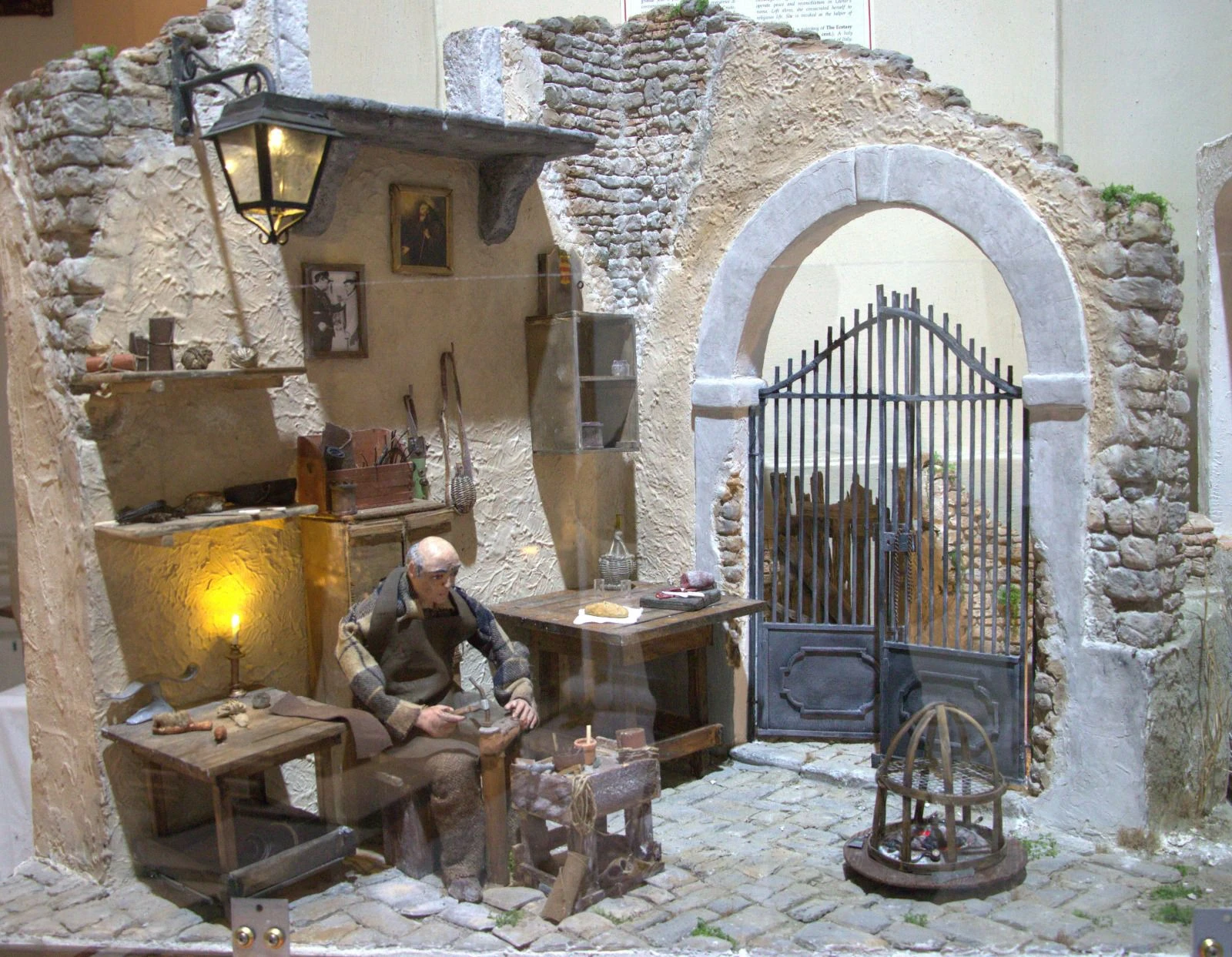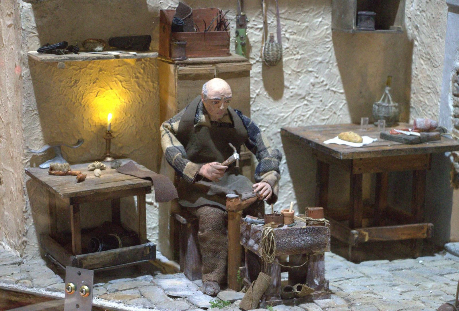 Tra le scene più emozionanti vi è il calzolaio, opera dedicata proprio da Enzo a suo padre, Francesco Rotella detto mastro Ciccio “U scarparu” (storica figura catanzarese che aveva la bottega nei pressi della Chiesa di San Giovanni) ritratto mentre lavora a suon di martello e a lume di candela. Nella stessa scena, al tepore del braciere si accompagna un angolo particolare in cui si scorgono un tagliere, una soppressata e un pezzo di pane: il cosiddetto “Prontu soccorsu”. Altro non era che un momento di aggregazione in cui si riunivano i ragazzi del quartiere, per degustare prodotti tipici e raccontarsi storie e aneddoti dell’epoca. Il tutto avveniva all’interno della bottega di Mastro Ciccio e quel dettaglio così minuziosamente riprodotto, non è sfuggito infatti, all’occhio attento di quei visitatori che hanno vissuto direttamente quei momenti in compagnia di Enzo e del suo caro papà.