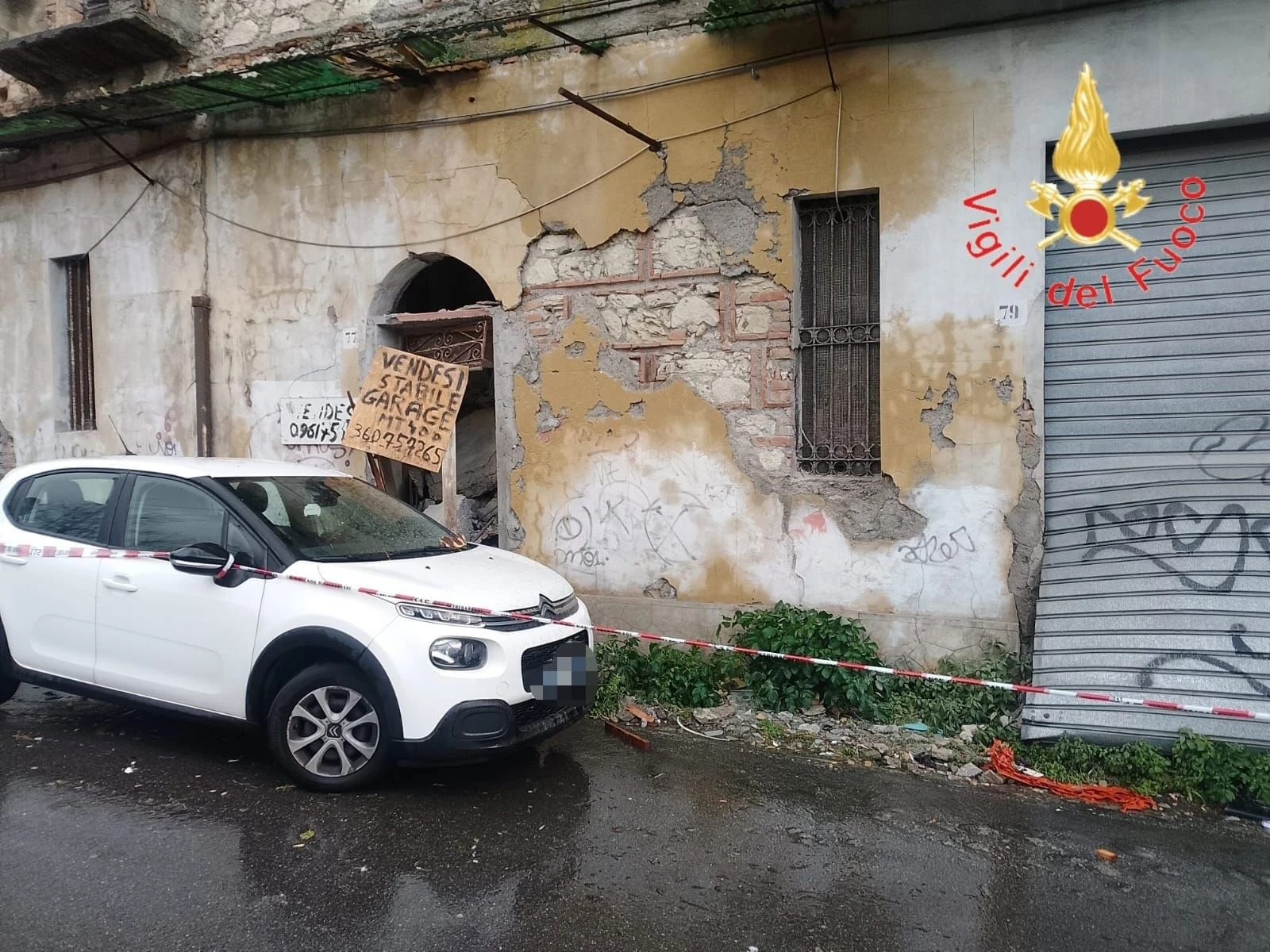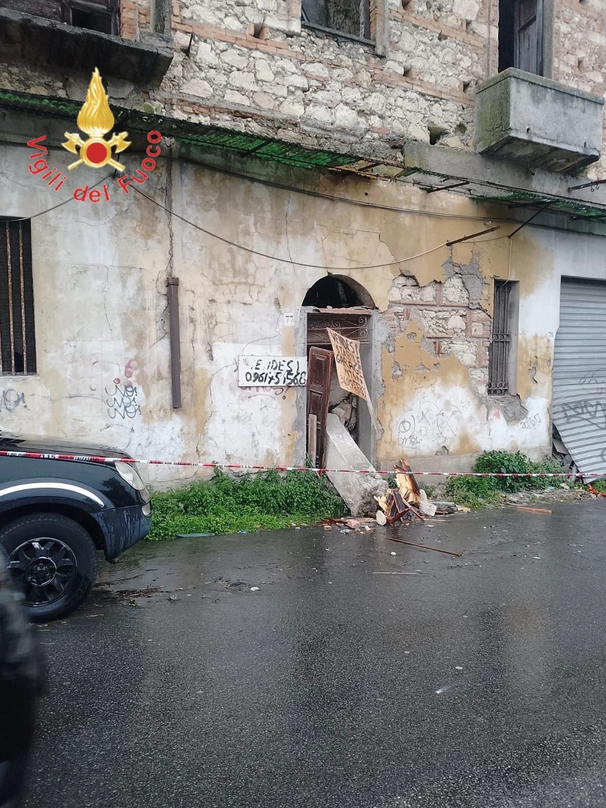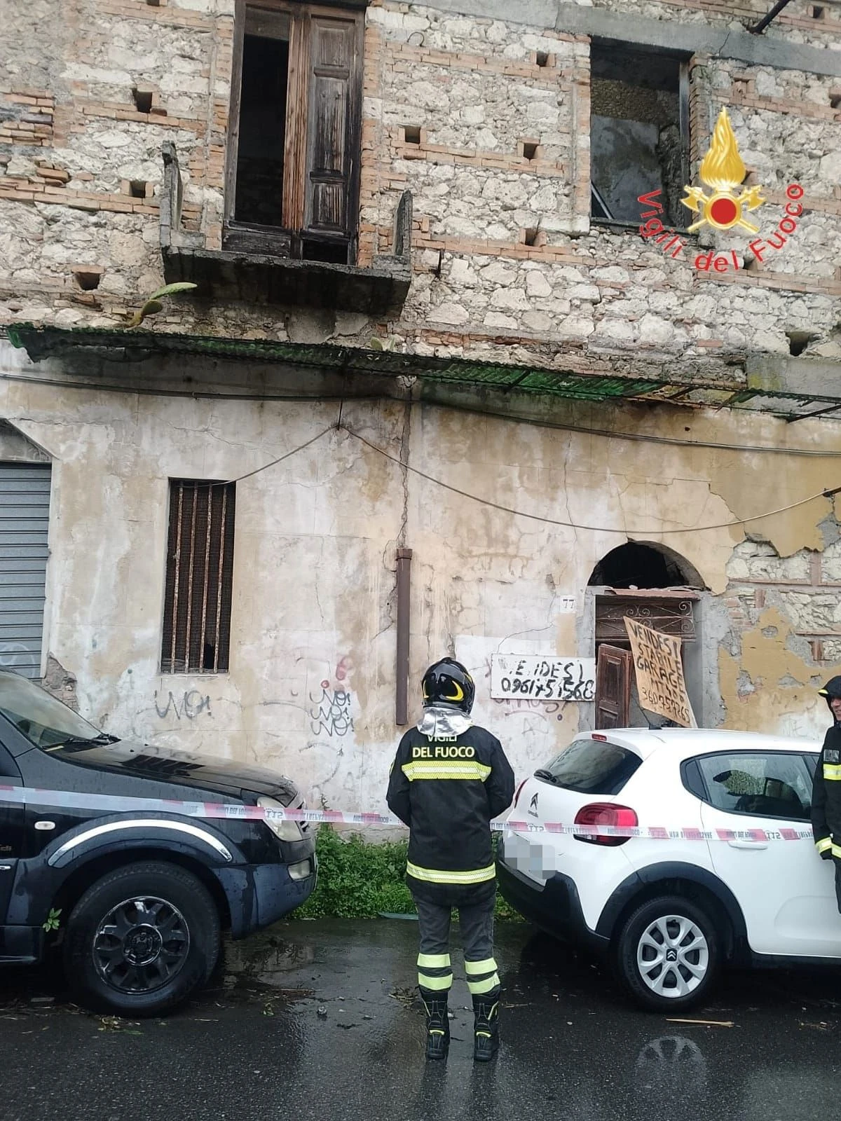 Una squadra dei Vigili del Fuoco è impegnata nel centro storico della città di Catanzaro, in Via Carlo V, per una verifica di stabilità di un edificio vetusto di tre piani. A seguito delle avverse condizioni meteorologiche e del prolungato stato di abbandono dell’immobile, si è verificato il crollo di porzioni di pareti e solai nella parte interna della struttura, determinando una situazione di instabilità delle murature perimetrali, che presentano un evidente rigonfiamento verso l’esterno.