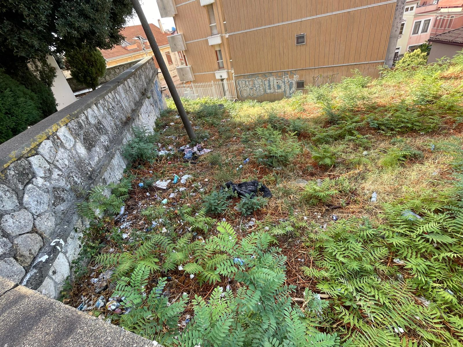 Esempi di degrado urbano a Catanzaro. Una cittadina segna due situazioni:una del piccolo spazio verde che fiancheggia la scalinata che congiunge via Piave con via Milano, l'altra dell'area posta all'incrocio fra via De Gasperi e via Mario Greco, entrambi invasi da rifiuti.