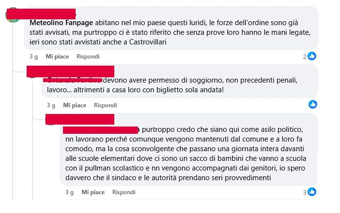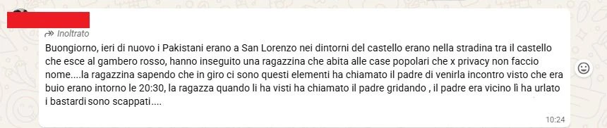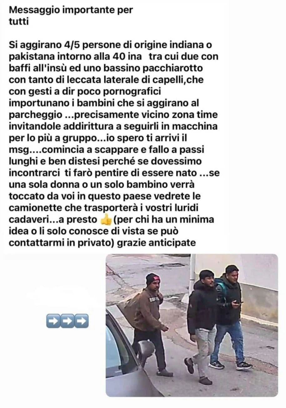 Un ulteriore messaggio, condiviso decine di volte, parla di un gruppo di 3 o 4 uomini di presunta origine straniera che si aggirerebbe nei pressi di scuole e zone frequentate da minori. Il contenuto, dal tono particolarmente acceso, riflette lo stato di esasperazione di parte della popolazione.