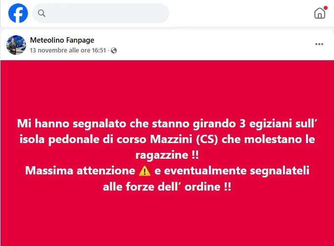 La seguitissima pagina Facebook “Meteolino FanPage” ha pubblicato un ulteriore avviso riguardante tre individui segnalati a Cosenza, lungo l’isola pedonale di Corso Mazzini. Anche in questo caso vengono riportati episodi di molestie verbali ai danni di ragazzine.
