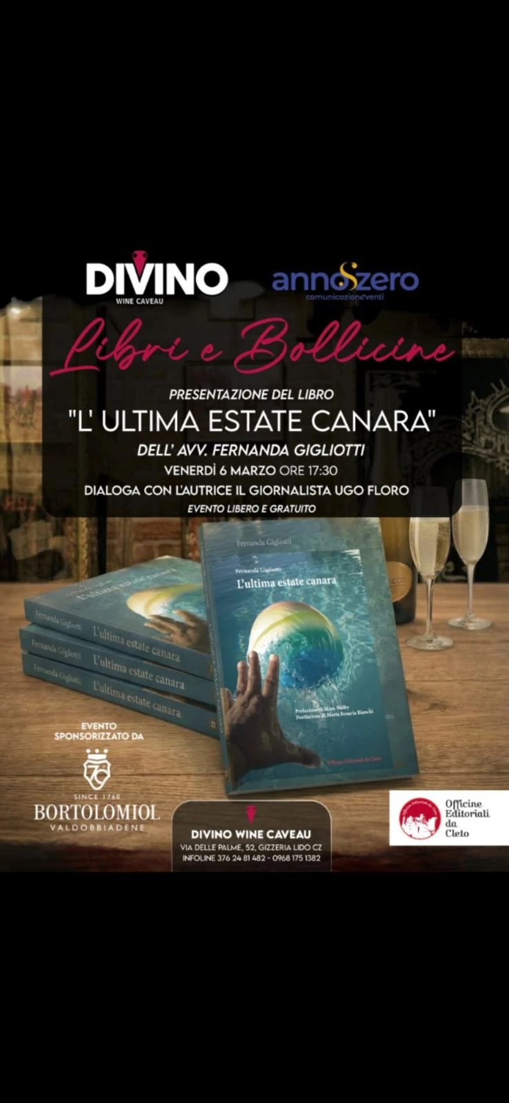 Si è tenuto a Gizzeria in una location di prestigio quale essere l'enoteca Divino Wine Caveaux, il primo appuntamento di Libri & Bollicine in Tour. L'appuntamento è stato seguito da un pubblico numeroso, al quale è stato offerto un flute di bollicine dal sommelier dell'enoteca . In questa cormice si è svolta la presentazione del libro dell'avv. Fernanda Gigliotti "L'ultima estate canara" moderato dal giornalista Ugo Floro. Il prossimo appuntamento è fissato per il 10 aprile alle ore 17,30 interverrà l'autrice Siria Scarfò con il libro "Io mi svelo".