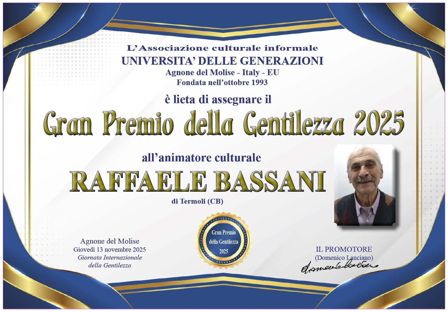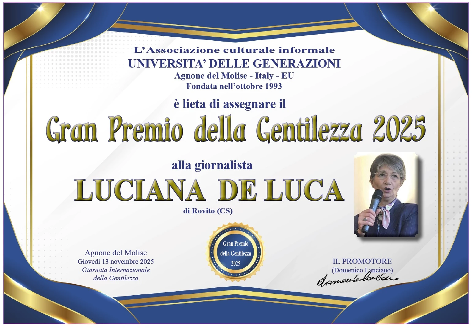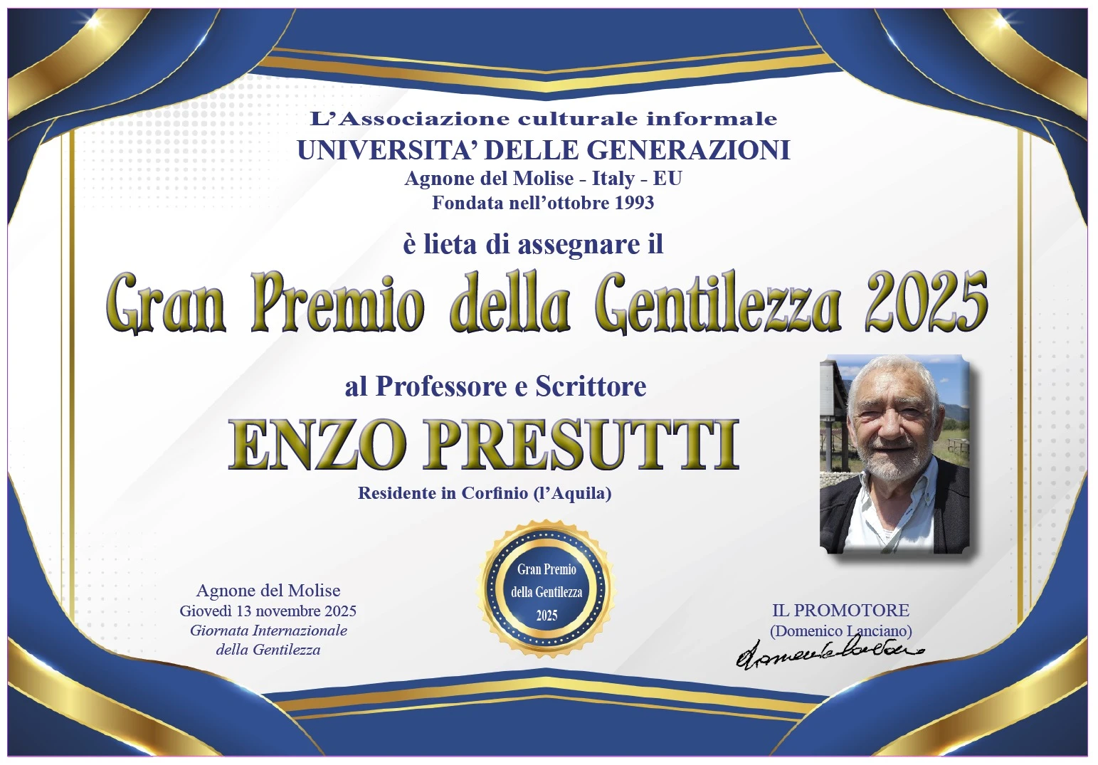 Come ogni anno dal 2009, l’Università delle Generazioni di Agnone del Molise celebra a modo suo la “Giornata internazionale della Gentilezza” (che ricorre ogni 13 novembre) assegnando il “Gran Premio della Gentilezza” a persone, personaggi e personalità che si distinguono nell’attuare quotidianamente questo grande valore etico, oggi ancora più importante in presenza di ampi e devastanti rigurgiti di ogni tipo di violenza, dallo sgarbo quotidiano al femminicidio, dalle ingiustizie spesso istituzionalizzate alle guerre più devastanti e atroci.