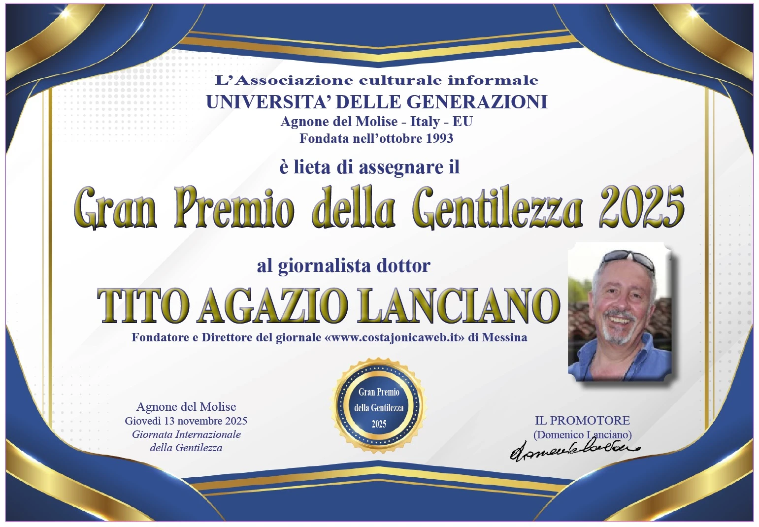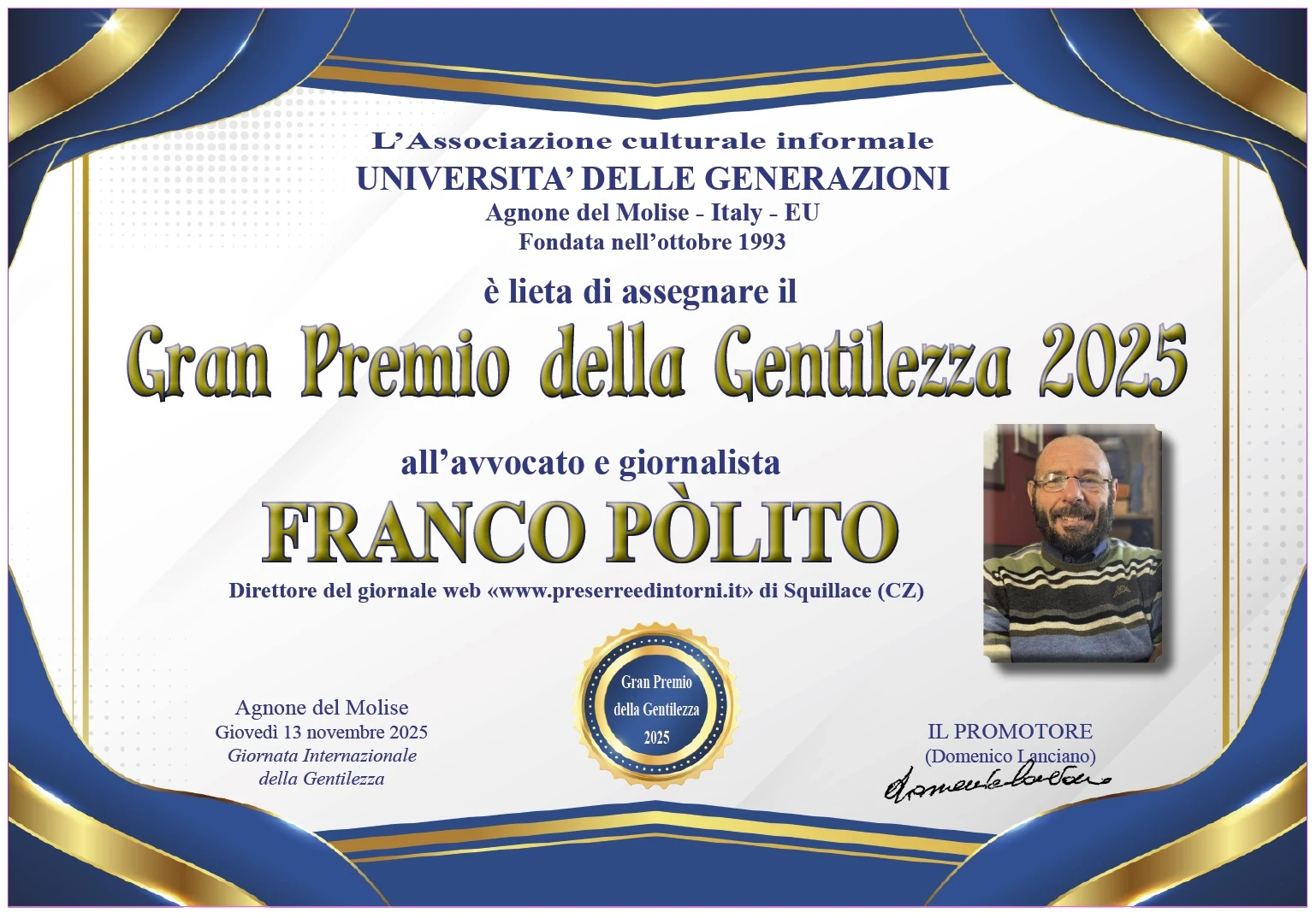Per l’anno 2025 il “Gran Premio della Gentilezza” è stato assegnato a dieci persone: ai calabresi Rita Barone di Catanzaro, Franco Pòlito di Squillace, Antonio Tassone di Siderno, Luciana De Luca di Rovito, Gaetano Drosi di Davoli; ai molisani Raffaele Bassani di Termoli e ai coniugi Antonio Litterio e Anna Di Tullio di Pescopennataro, all’abruzzese Enzo Presutti di Corfinio e a Tito Agazio Lanciano di Messina.