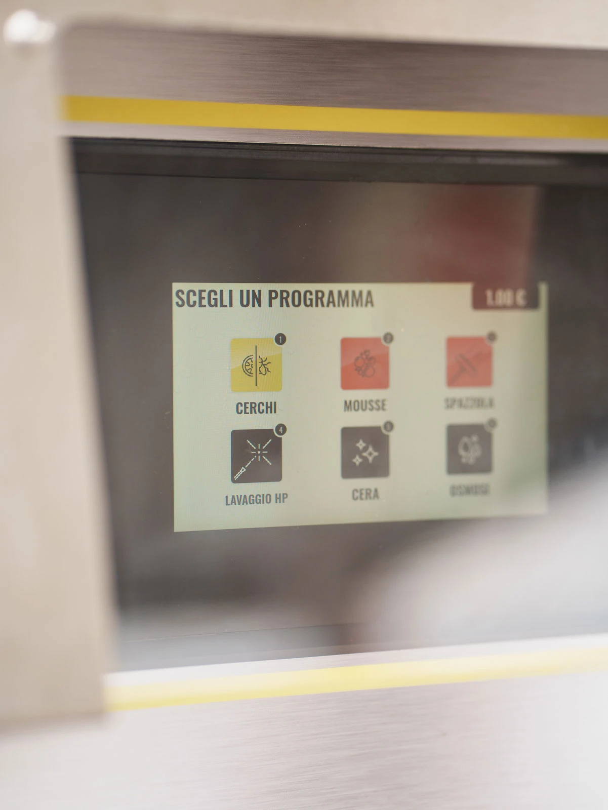Tutto è progettato per rendere ogni fase del lavaggio semplice e piacevole: dagli aspiratori professionali ai getti d’aria compressa, dagli erogatori di profumo al distributore automatico di panni in pelle, fino alle apparecchiature dedicate alla pulizia degli interni.