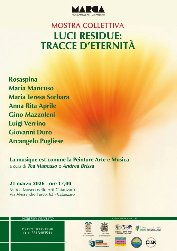 02 marzo 2026 11:13Cosa resta quando il tempo passa? Resta la luce. Sabato 7 marzo 2026, alle ore 17, il MARCA – Museo delle Arti di Catanzaro accende i riflettori su "Luci Residue: Tracce d’Eternità", l’attesa mostra collettiva a cura di Tea Mancuso.