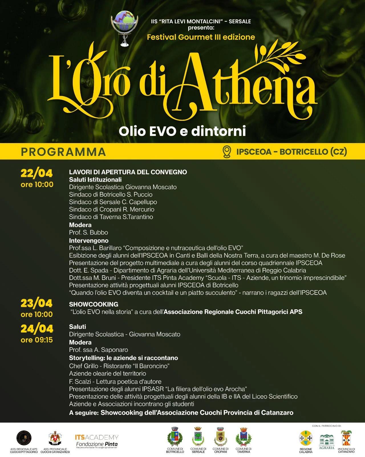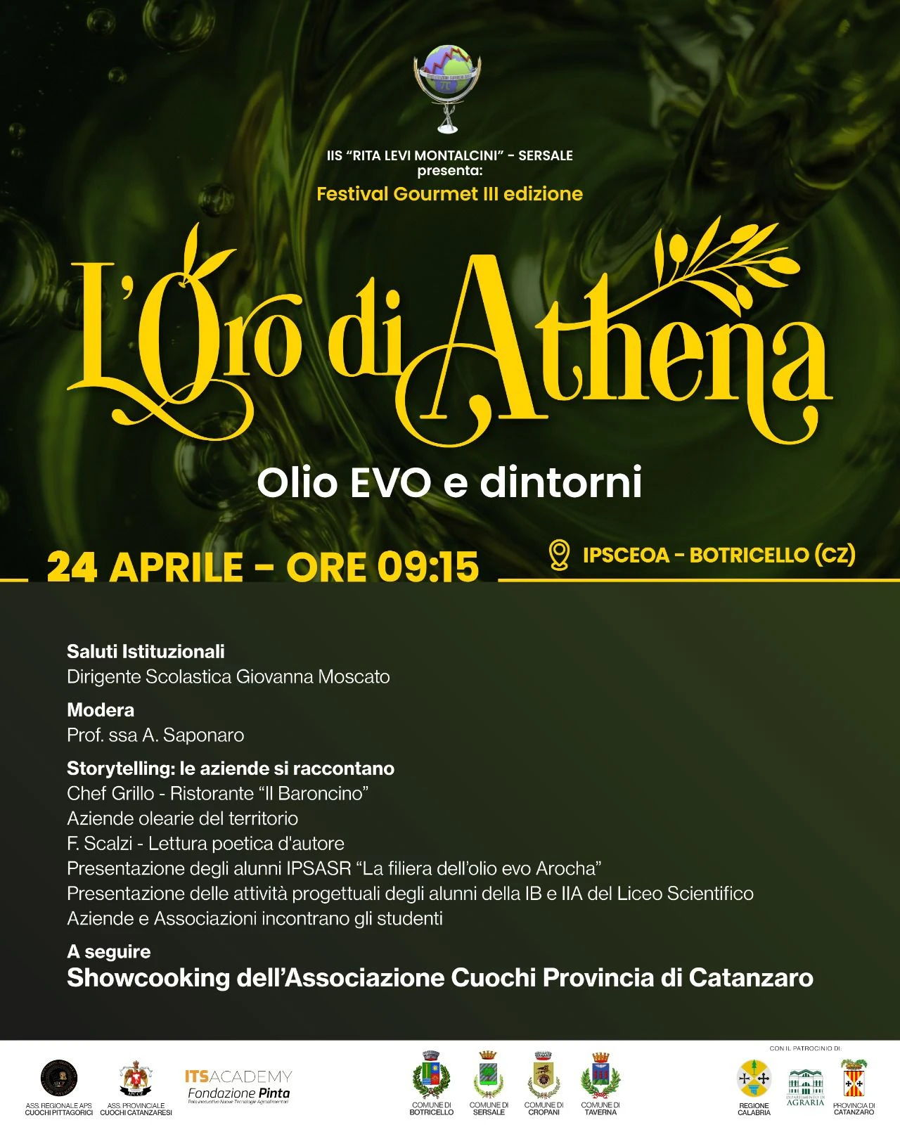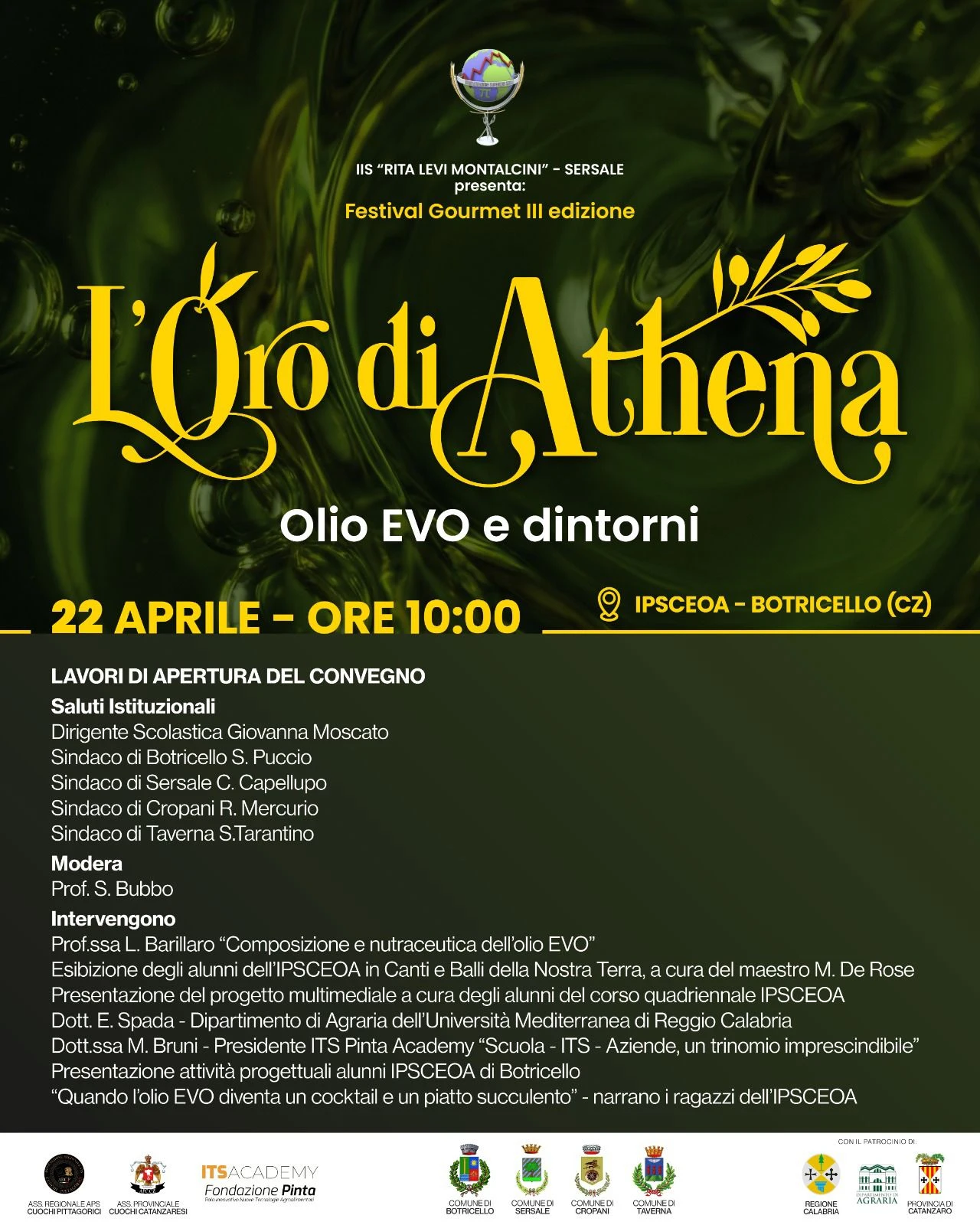 20 aprile 2026 12:59Dal 22 al 24 aprile, i locali dell’Istituto Professionale di Stato per i Servizi Commerciali, Enogastronomici e dell'Ospitalità Alberghiera “Rita Levi Montalcini” di Sersale sede di Botricello si trasformeranno nel cuore pulsante della cultura gastronomica calabrese. Giunge alla sua quarta edizione il Festival Gourmet, quest’anno intitolato significativamente "L'oro di Athena", un omaggio alla pianta sacra che da millenni definisce il paesaggio e l’economia del nostro territorio: l’ulivo.