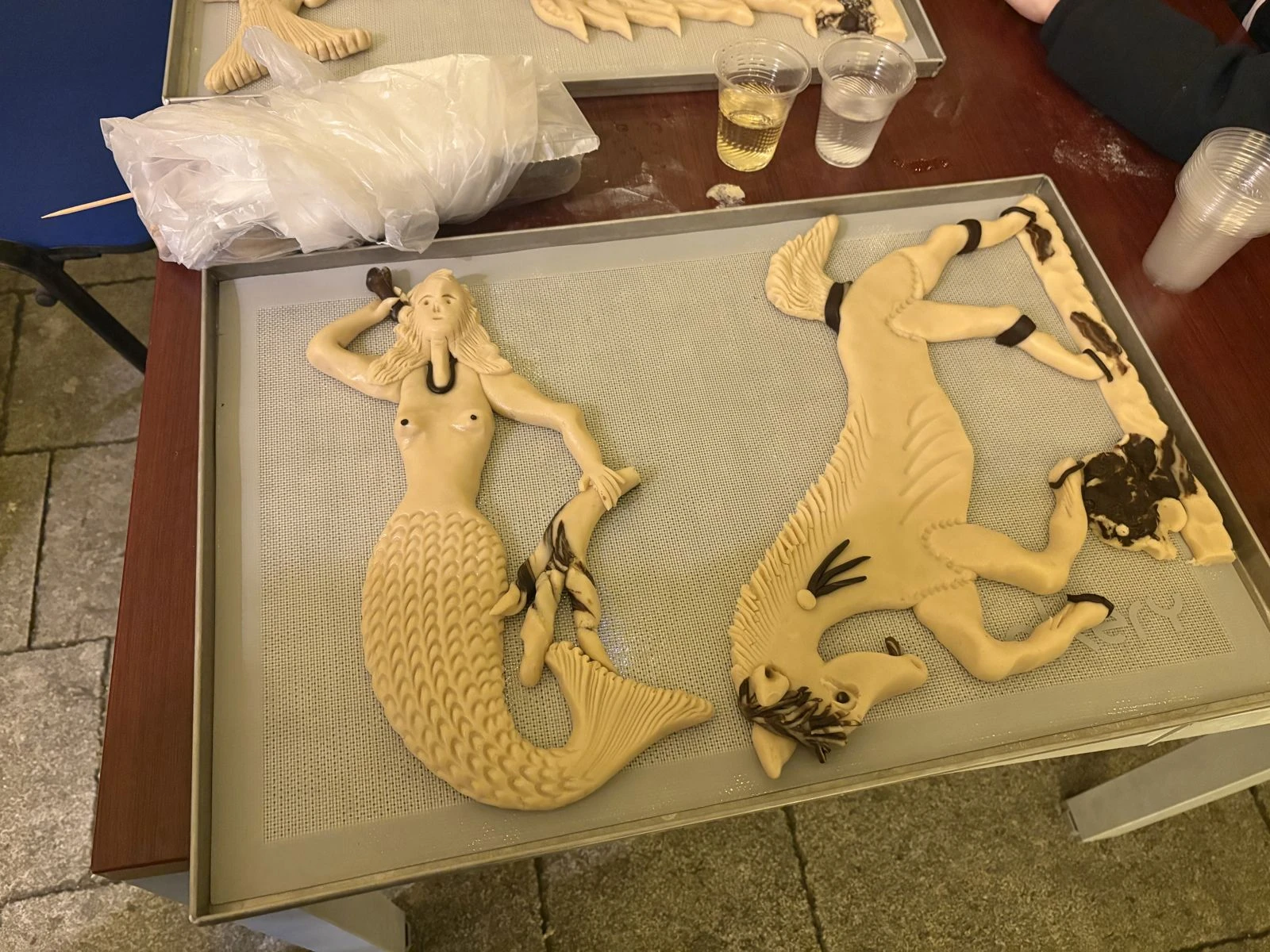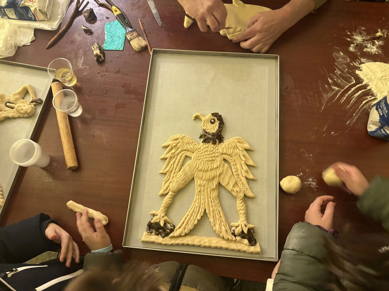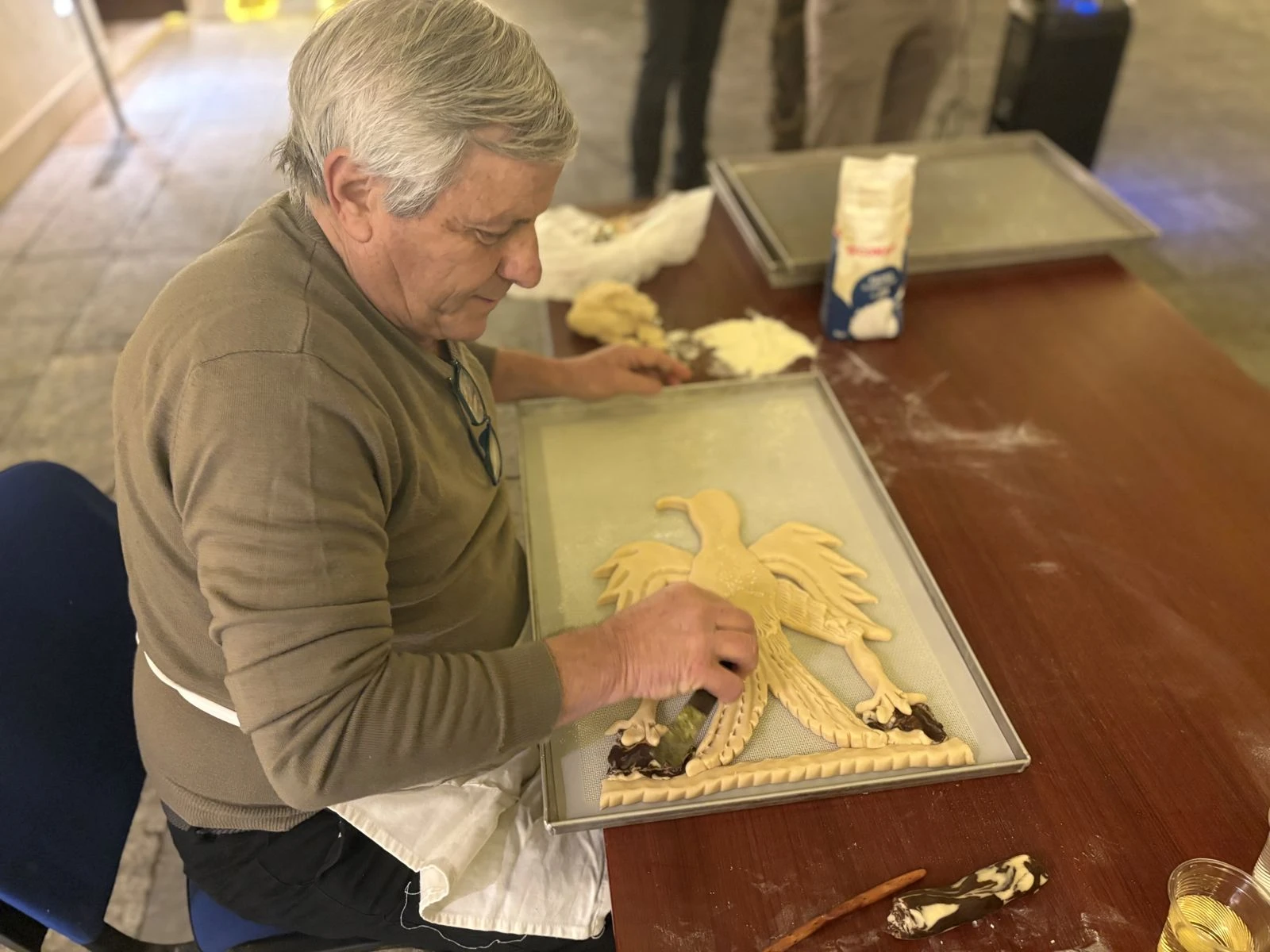 Una volta varcata la soglia del San Giovanni, il pubblico ha trovato un ambiente vivo, segnato da punti di interesse che dialogavano tra loro: alcuni musicisti dell’orchestra Tchaikovsky hanno animato gli spazi con intermezzi musicali, mentre un angolo dedicato a Babbo Natale ha attirato i più piccoli in un ambiente costruito con cura scenografica. Poco distante, il maestro Monardo della storica Dolciaria Monardo di Soriano Calabro ha realizzato illustrazioni con un composto di farina e miele, creando figure che richiamano l’immaginario natalizio e la cultura calabrese, tra cui l’aquila reale che ha catturato l’attenzione del pubblico per la precisione e la forza simbolica.