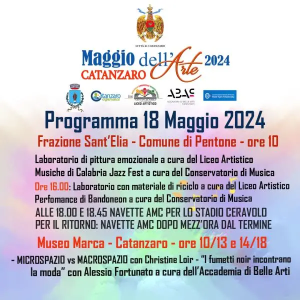 Inoltre, si ricorda che oggi 17 maggio 2024  “Maggio dell’Arte” sarà nel quartiere Santa Maria. Dalle ore 10.00, presso la Scuola Mattia Preti, si terrà la Perfomance Tableau vivant di quadri di Caravaggio, Mattia Preti e altri autori a cura del Liceo Artistico “De Nobili” e con musiche del Conservatorio. Inoltre, anche il workshop a cura dell’Accademia di Belle Arti con il pianista Davide Greco.  Nel pomeriggio del 17 maggio, in Piazzetta della Libertà, nel centro storico: esposizioni artistiche a cura di “Divercity” ed accompagnamento musicale del Conservatorio con il pianista Davide Di Maria; Notte bianca al Conservatorio - Palazzo Stella.