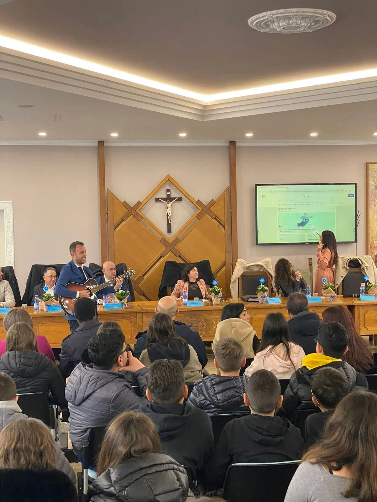 Ad intervenire è stato poi il Dirigente Scolastico dell’ Ic Vittorio De Seta Angelo Gagliardi che ha spiegato quanto è fondamentale includere questi ragazzi e ragazze speciali nella comunità scolastica e di come sia costante e di supporto l’impegno dei docenti che fungono da collante con le famiglie facendole sentire cosi parte integrante del percorso scolastico dei loro figli. A seguire gli interventi della Dottoressa Eleonora Dardano neuropisichiatra che ha rimarcato quanto sia fondamentale riconoscere i segnali precoci di autismo fin dalla tenera età e di Fabio Iannuzzi Presidente dell’Associazione Nuvola che promuove l’inclusione e l’autonomia per i bambini e ragazzi affetti con disturbi dello spettro autistico e con altre disabilità e che opera sul territorio limitrofo con il contributo di figure esperte e volontari. il musicista ed educatore Francesco Iaconantonio ha cantato insieme agli studenti presenti il brano 'Senza spazi e confini' di cui è autore e che è stato ispirato dalla sua esperienza nel campo dell’autismo, a tal punto da inserire nel videoclip del brano i disegni del fumettista Luca Talarico un ragazzo affetto da autismo con un dote speciale.