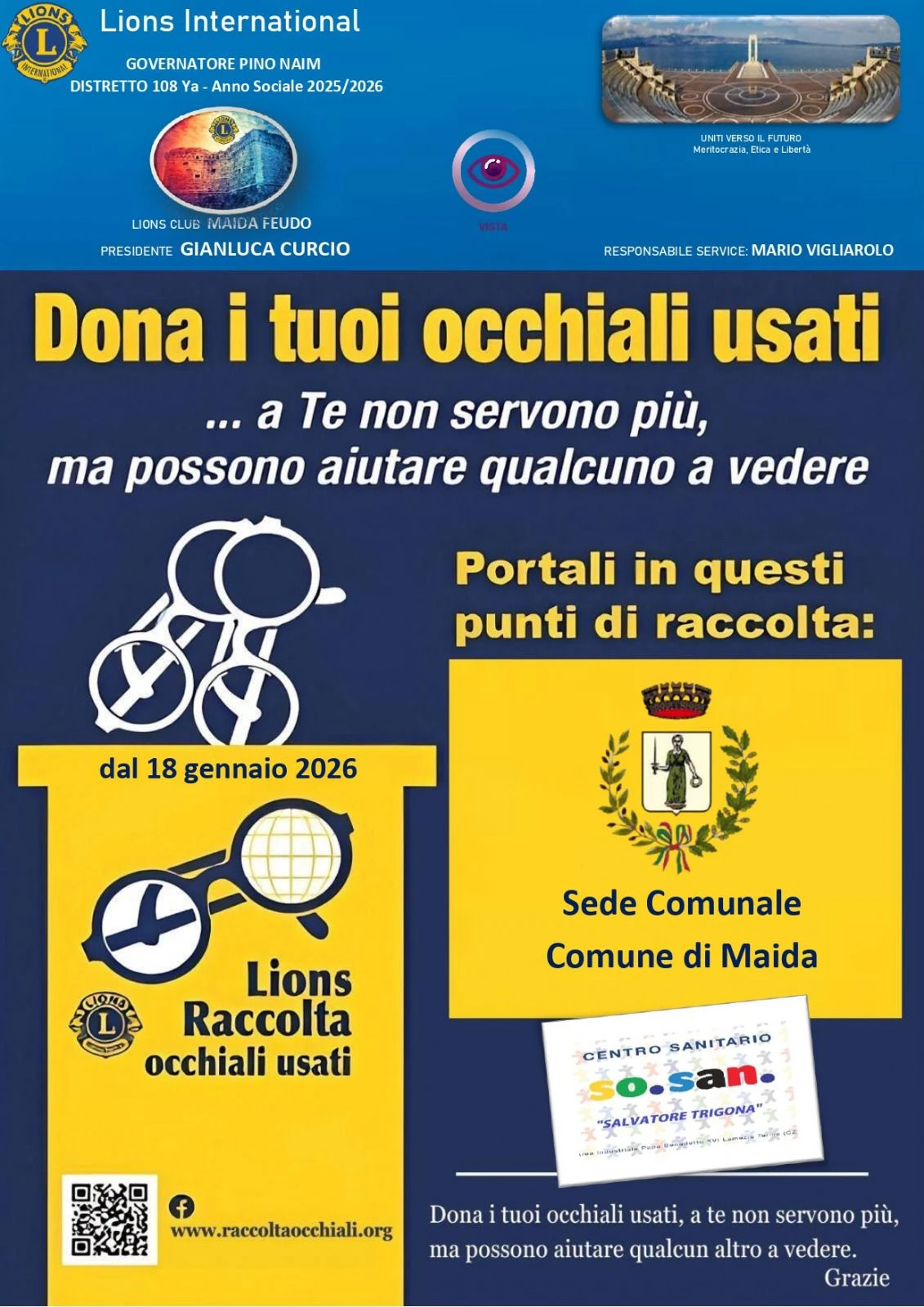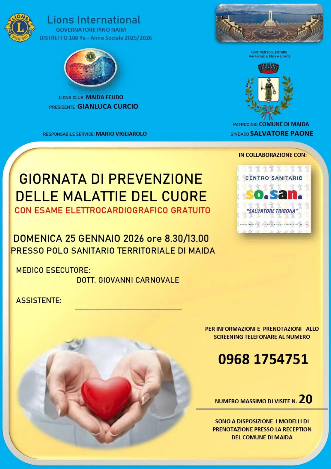 L’iniziativa vedrà la stretta collaborazione del Centro Logistico So.San.-Lion “Salvatore Trigona” e del Comune di Maida; le visite gratuite saranno effettuate dal dottor Giovanni Carnovale. Nella reception del Palazzo Comunale saranno messi a disposizione i modelli di prenotazione.