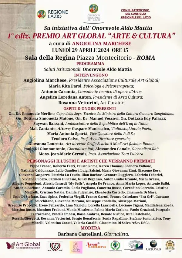 Per l’occasione presenti anche numerosi ospiti d’onore, tra loro Paolo Di Giannantonio, giornalista RAI; Mons.Jean-Marie Gervais Pres. Assoc. Tota Pulchra; Mal cantante; Pippo Franco attore; Giovanna Lauretta. Art director Griffe Scarlatti Mod’Art fashion Roma; Maria Antonia Spartà Vice Questore della P. di S.;Teodoro Calvo, Prof.Avv. Direttore Generale; Gaspare Maniscalco, Violinista, Liutaio,Poeta; Saywan Barzani, Ambasciatore Rep.dell’Iraq in Italia; De. Emanuele Merlino Capo Segr. Tecnica del Ministro della Cultura Gennaro Sangiuliano; Maria Giovanna Elmi Presentatrice RAI.