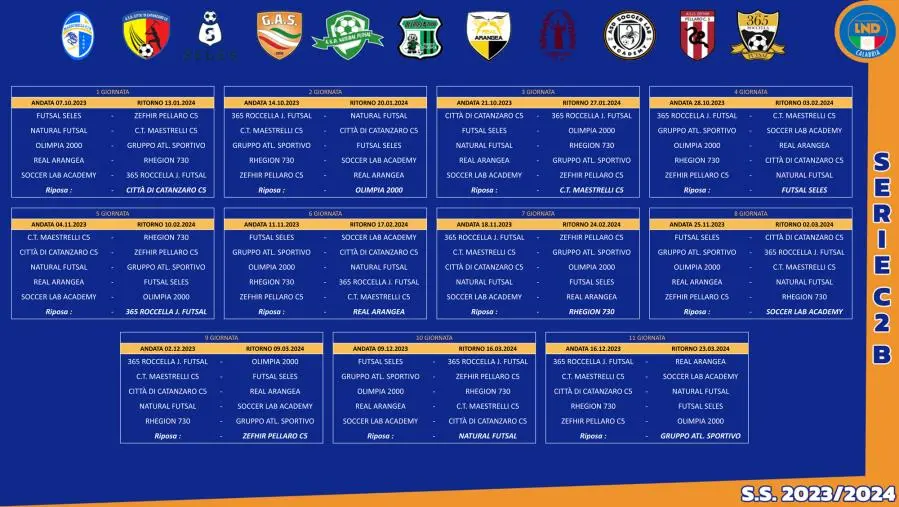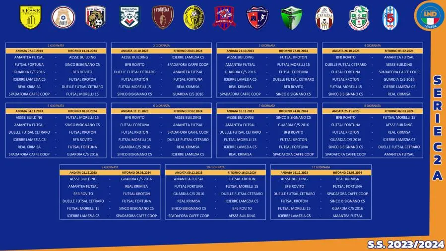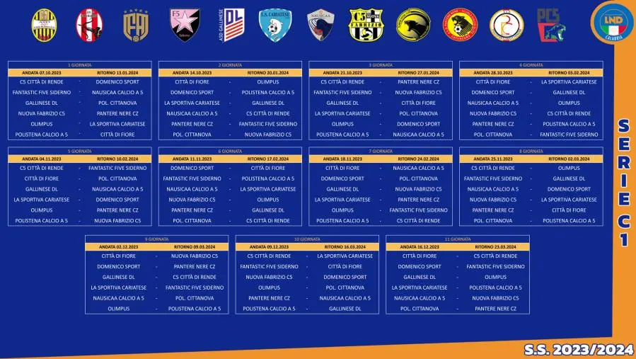 28 settembre 2023 20:35Si è tenuta questo pomeriggio la presentazione dei calendari dei campionati di Calcio a 5 Serie C1 e Serie C2 per la stagione sportiva 2023/2024. Il momento è stato preceduto dalla consegna dei premi disciplina alle società vincitrici le rispettive classifiche dei campionati 2022-2023, nello specifico Polistena C5 (Serie C1), Futsal Morelli (Serie C2 girone A), Pantere Nere Cz (Serie C2 girone B), Blingink Soverato (Under 19), Casali del Manco (Femminile), E. Coscarello (Serie D girone A), Zagarise (Serie D girone B) e Reghion (Serie D girone C). Premiate anche le società Città di Fiore e C.T. Maestrelli rispettivamente per 20 anni e 25 anni di affiliazione. Riconoscimenti anche per gli arbitri promossi alla C.A.N. 5 Francesco Azzarà (Sez. Reggio Calabria), Rolando Chiodo (Sez. Catanzaro), Maurizio Cipolla (Sez. Cosenza), Gregorio Mercurio (Sez. Catanzaro), Matteo Speziale (Sez. Cosenza) e Giuseppe Suriano (Sez. Vibo Valentia).