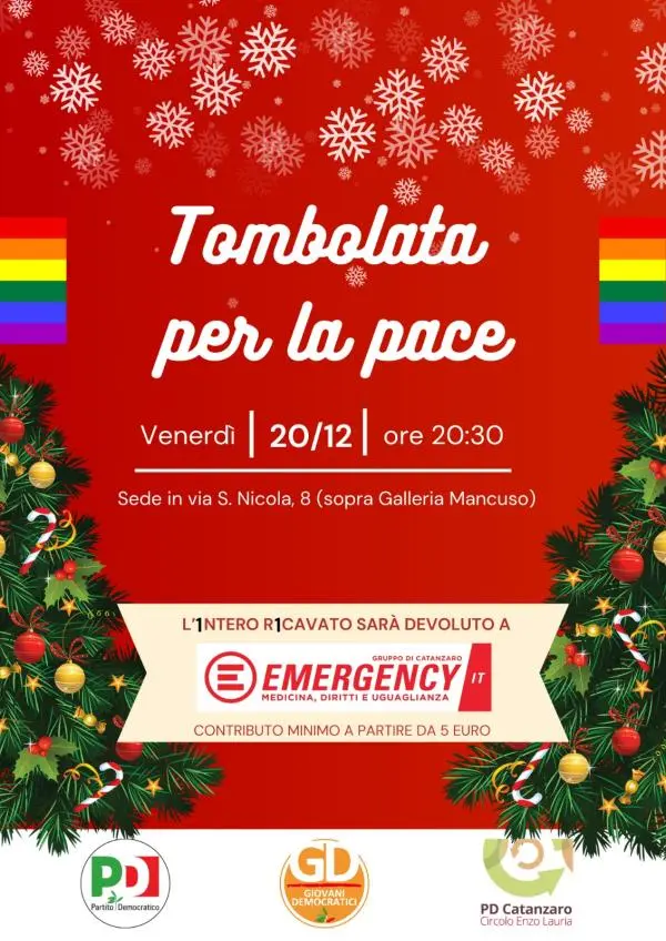 Inoltre, oggi alle ore 20:30 si svolgerà la Tombolata per la Pace con Emergency, un momento di festa e solidarietà sempre presso la sede in Via San Nicola, 8. L'intero ricavato sarà devoluto a Emergency, l’organizzazione umanitaria fondata da Gino Strada, impegnata a garantire cure mediche gratuite e di qualità nelle aree di conflitto.