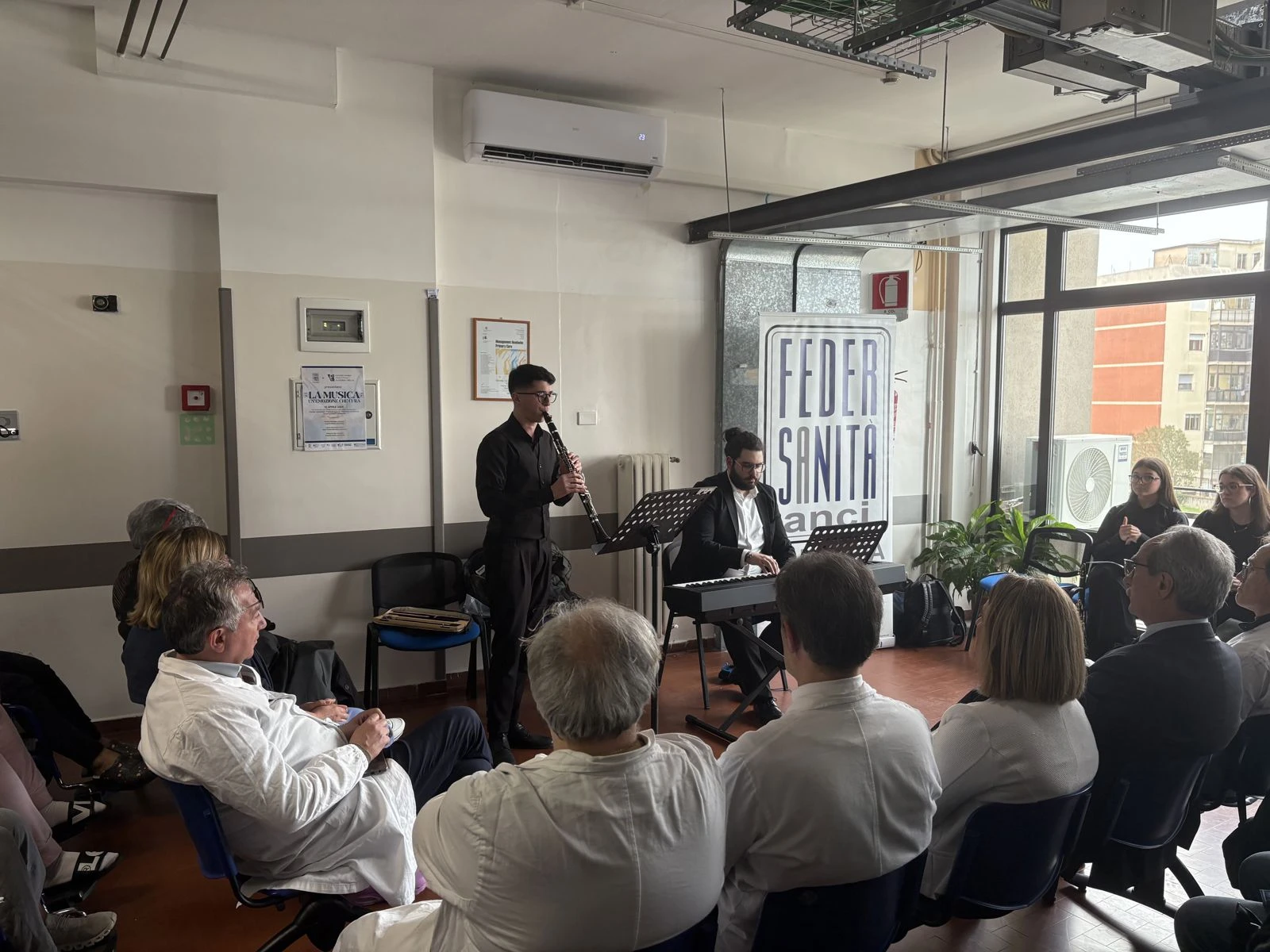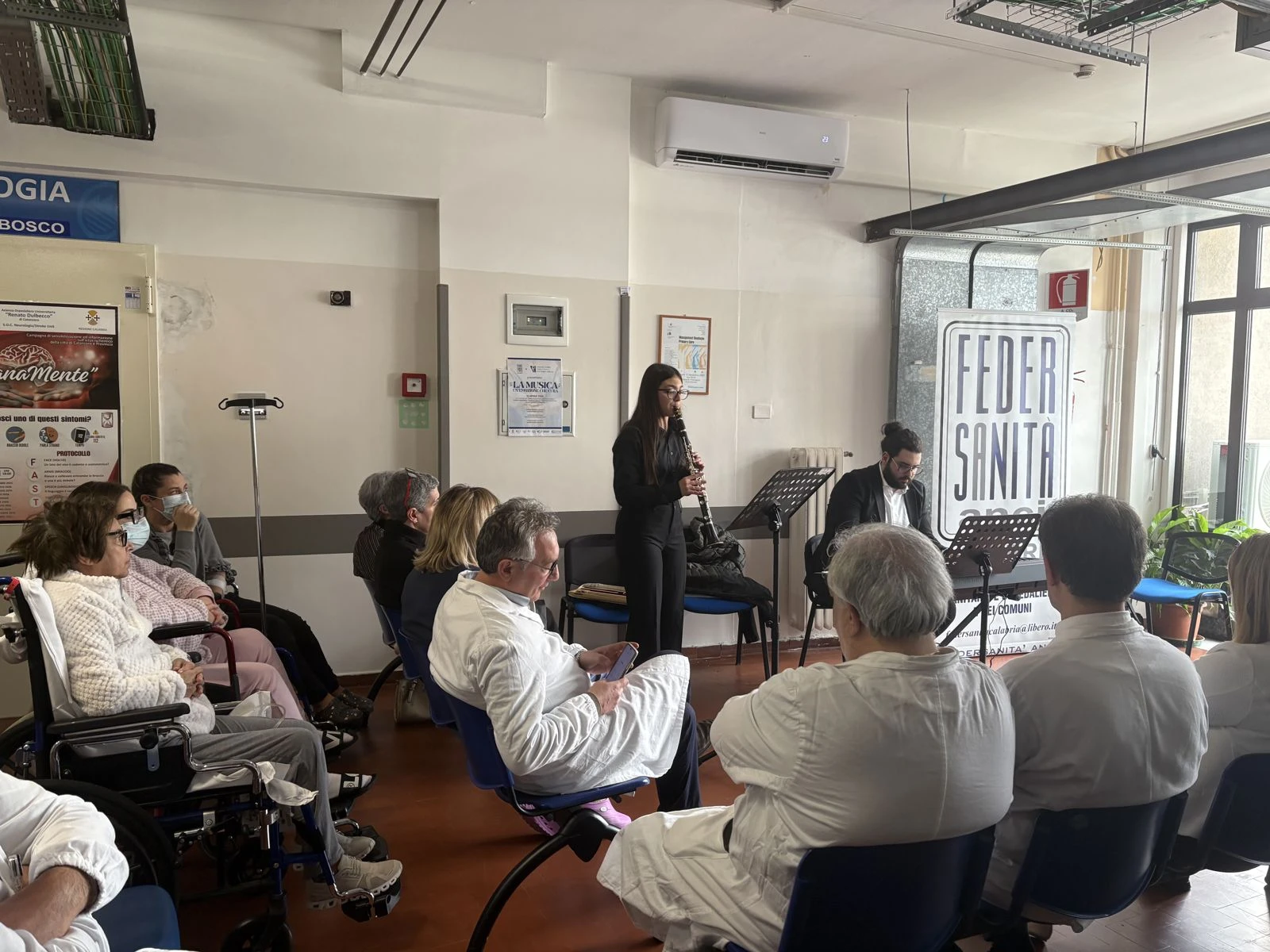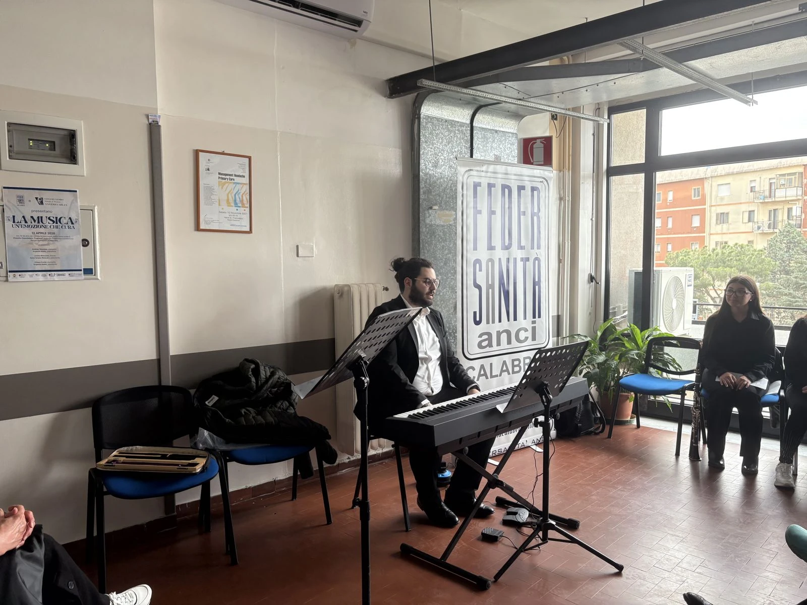 Può essere che il tempo, dentro un reparto di Neurologia, scorra con un ritmo tutto suo, scandito dai monitor e dalle attese silenziose dei familiari. Eppure, nel primo pomeriggio di lunedì, quel battito monocorde è stato interrotto dal respiro di un clarinetto e dal tocco vellutato di un pianoforte. Le note di “Pagina d’album” di Michele Mangani hanno iniziato a scivolare tra i corridoi del primo piano del Presidio “Pugliese”, trasformando l’atrio della scala A in un’insolita sala da concerto per l'evento “La musica, un’emozione che cura”. Non è stata solo un’esibizione, ma un atto di “umanizzazione delle cure” in piena regola, nato dalla sinergia tra Federsanità Anci Calabria e il Conservatorio Statale “Saverio Arlia”.