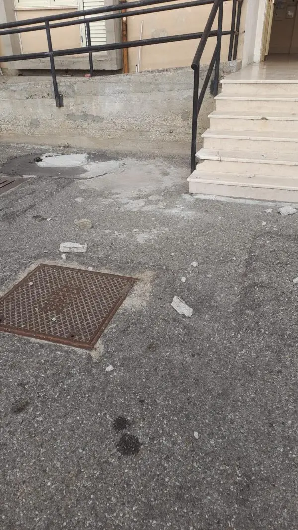 Pezzi di cornicione cadono dai piani alti di un condominio di Via Teano nel quartiere Aranceto di Catanzaro.