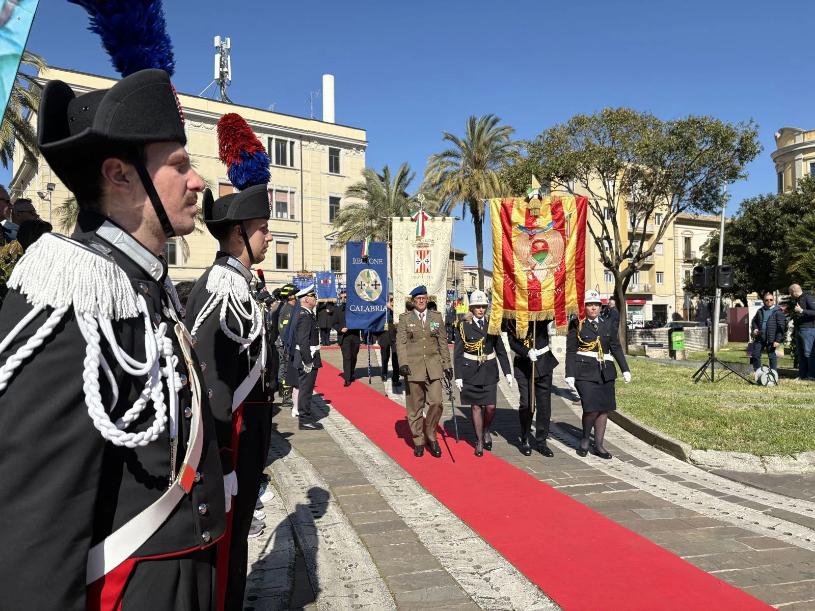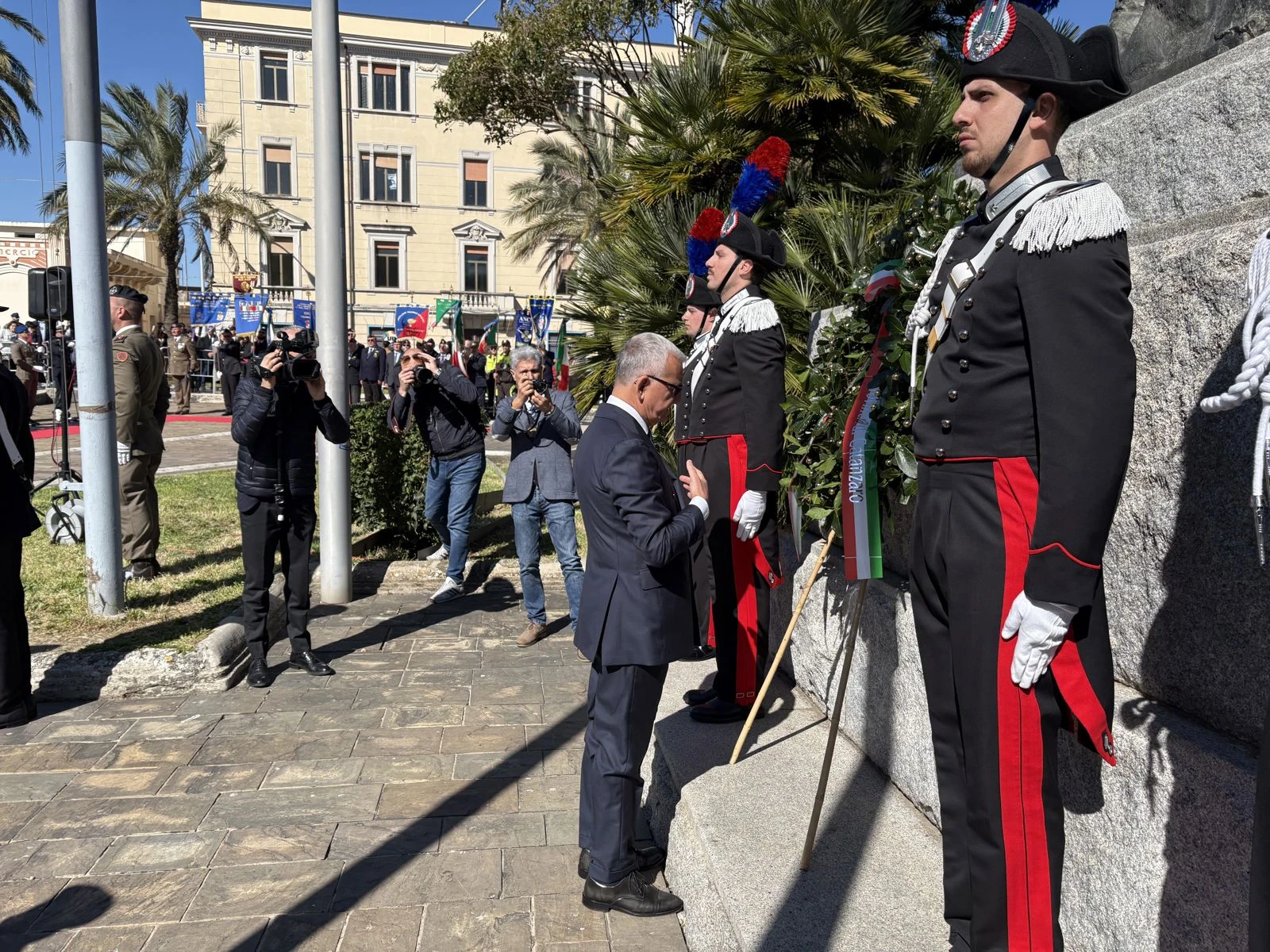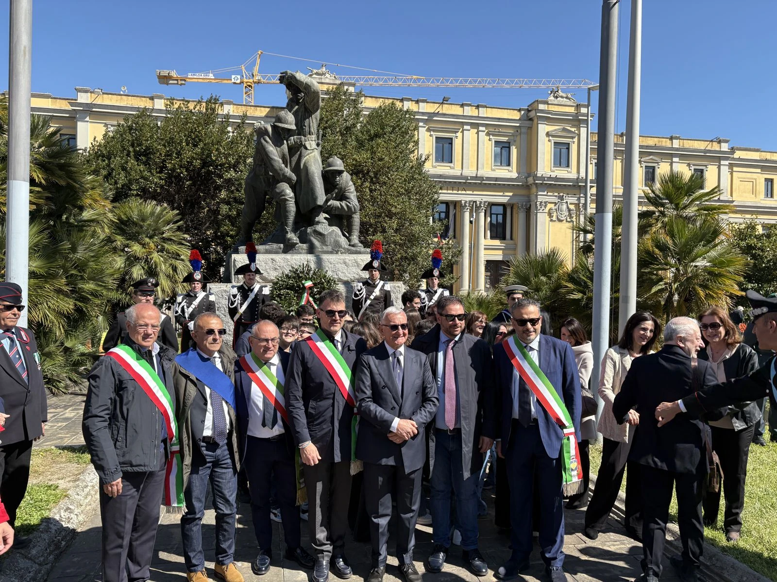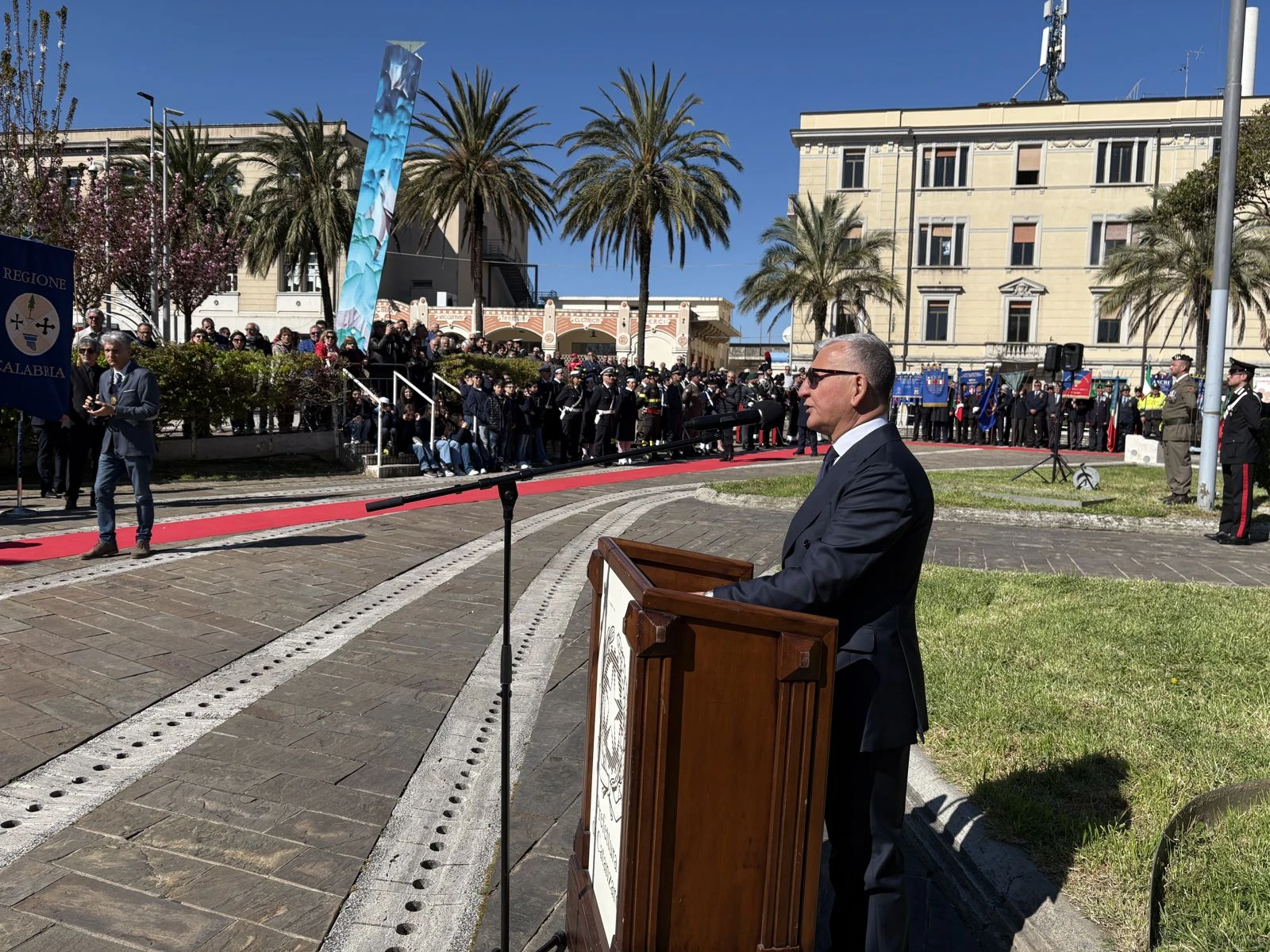 Il cerimoniale ha seguito il passo dei plotoni interforze e l’ingresso dei Gonfaloni, ma il battito della piazza è cambiato quando il Prefetto Castrese De Rosa ha deposto la corona d’alloro ai piedi del Monumento ai Caduti. Al suo fianco, a onorare il marmo, il Comandante della Legione Carabinieri Calabria, in una blindatura istituzionale che ha dovuto fare a meno della Sottosegretaria all’Interno, Wanda Ferro. “Mi ha chiamato pochi minuti fa” — chiarisce subito De Rosa durante il suo intervento — “un’indisposizione la costringe a letto, ma ci teneva a farvi avere il suo saluto e la sua vicinanza”. Un’assenza fisica che non ha impedito al Sottosegretario di far sentire la propria presenza a quella che il Prefetto definisce una “parte integrante della sua identità”.