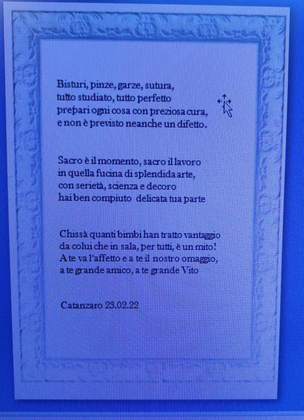 Nell’ambito di un Workshop sul Neuroblastoma, tenutosi il 23 febbraio nella Sala delle Conferenze dell’Ospedale Pugliese – Ciaccio di Catanzaro, il Primario della SOC di Chirurgia Pediatrica, nonché Capo Dipartimento Materno – Infantile, dottor Domenico Salerno, ha consegnato al Signor Vito Ferro una targa, un regalo ed una dedica in versi".