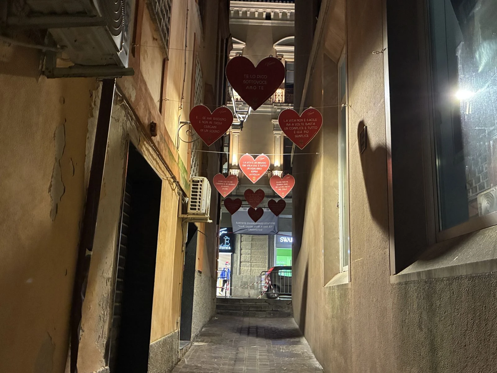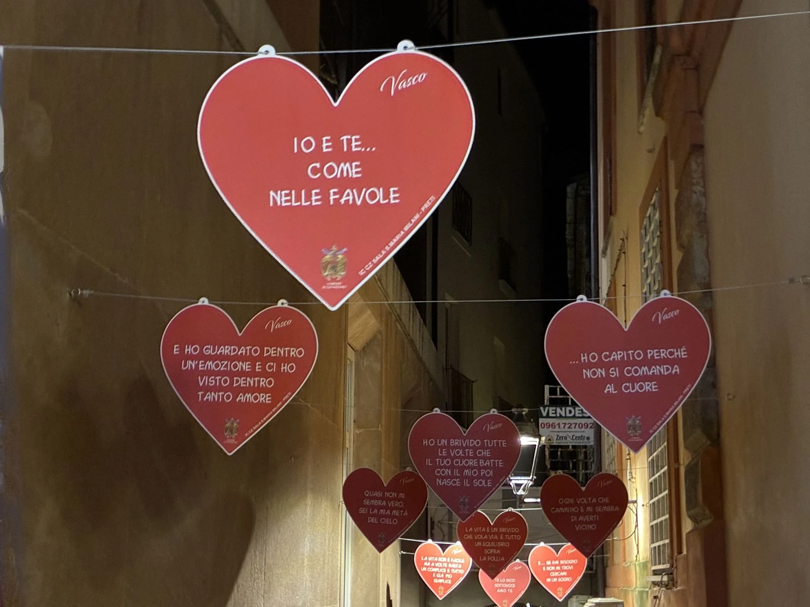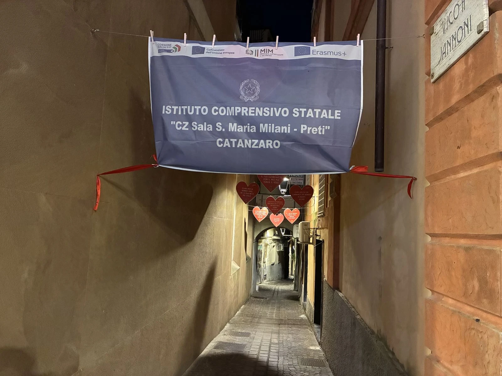 Non servono grandi palchi né eventi roboanti per accendere una città. A volte basta un vicolo, qualche cuore appeso e parole che tutti riconoscono. Ieri sera, nel centro storico di Catanzaro, Vico II Jannoni si è riempito di colore, musica e significato grazie all’iniziativa delle ragazze e dei ragazzi dell’Istituto Comprensivo Catanzaro Sala Santa Maria Milani-Preti, che hanno scelto le frasi delle canzoni di Vasco Rossi per restituire bellezza a uno dei vicoli di Corso Mazzini.