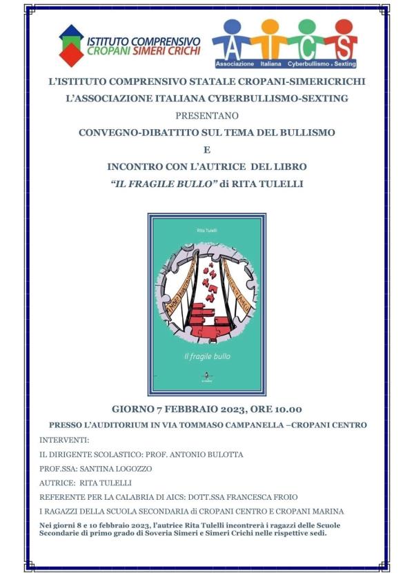 Al tavolo dei relatori la Dottoressa Rita Tulelli, autrice del libro “Il fragile Bullo” e presidente di Universo minori. La stessa, che ha ascoltato con attenzione e risposto alle numerosissime domande dei ragazzi sul suo libro e non solo, ha illustrato ai presenti l’urgenza e l’importanza del dialogare su queste tematiche per ricordare loro che non sono soli e che ognuno può e deve fare la propria parte per contrastare l’ombra del bullismo e del cyberbullismo, attraverso strumenti preziosi come la consapevolezza, l’ascolto e la denuncia dei casi subiti in prima persona o da altri.