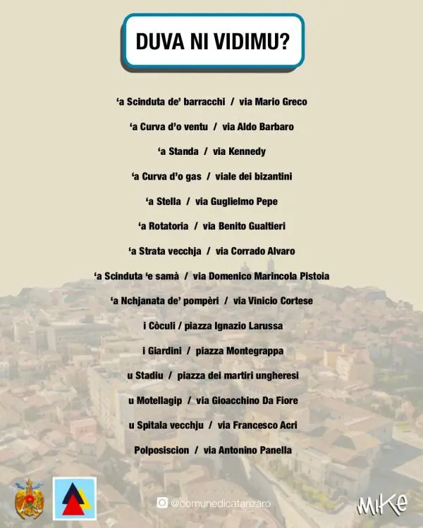 "Duva ni vidimu " non è solo un gioco di parole: è un progetto che va oltre l'arte, diventando un atto di recupero della storia più e meno recente della città. Il progetto, curato dall'artista Michele Crispino, in arte Mike, e curato dall’attore e regista Enzo Colacino, è il frutto una grande passione per le tradizioni del nostro popolo. Le targhe, che sostituiscono i tradizionali nomi delle vie con la denominazione dialettale usata dai catanzaresi, sono un chiaro richiamo alla bellezza della nostra lingua, ancora viva e presente nei racconti di generazione in generazione.