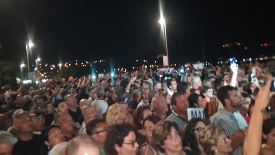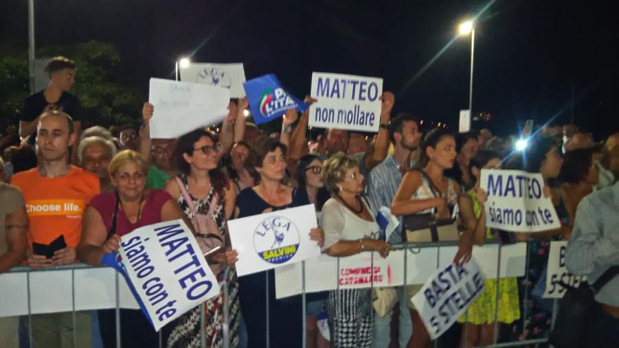 Di contro, all'ingresso del paese c'è una scritta "Benvenuto ministro Salvini". Davanti al palco dove il leader della Lega terrá il suo comizio, sovrastato da uno striscione con su scritto "Prima gli italiani", i sostenitori del "capitano" stanno attendendo il suo arrivo da Isola capo Rizzuto.