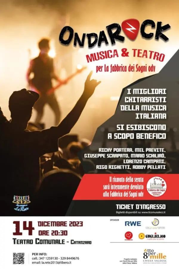 "Ondarock Musica & Teatro per “La Fabbrica dei Sogni odv” vedrà come protagonisti sul palco del Teatro Comunale di Catanzaro il prossimo 14 dicembre, con un concerto lungo 2 ore, Ricky Portera, il fondatore e chitarrista degli Stadio, di Lucio Dalla e di tanti altri, Mario Schilirò, chitarrista storico di Zucchero, Giuseppe Scarpato che accompagna alle chitarre da oltre 20 anni Edoardo Bennato. Inoltre ci saranno Mel Previte chitarrista, Rigo Righetti bassista, Robby Pellati alla batteria che hanno suonato nel gruppo La Banda che ha accompagnato Ligabue per molti anni.