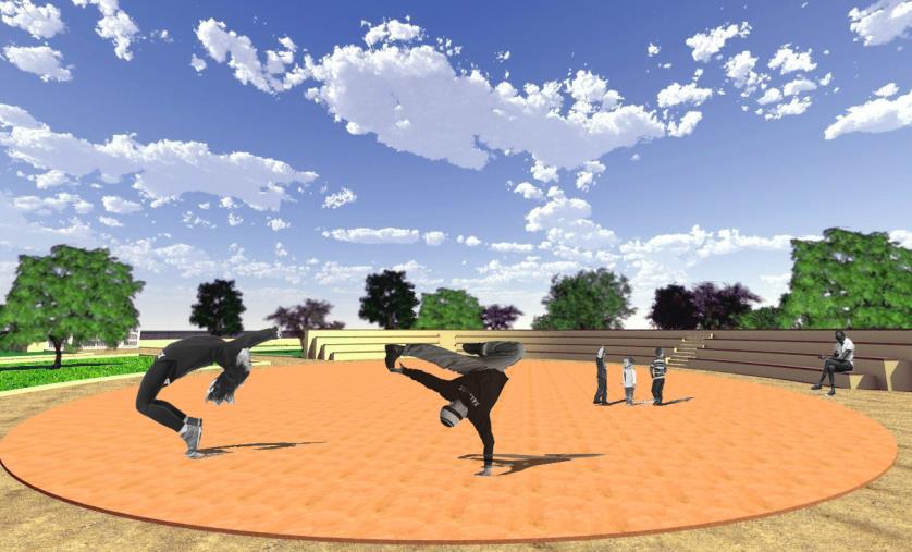 Teatro. L'impianto strutturale esistente, risulta essere concepito morfologicamente come l’impianto dell’antico teatro greco, offrendo svariate possibilità di utilizzo, dai piccoli concerti alle rappresentazioni. L'intervento interesserà nello specifico la finitura degli elementi costituenti tali impianto: gradonate e area di scena. Le sedute, disposte sulle gradinate semicircolari,saranno realizzate in legno composito del tipo "GREENWOOD", mentre le alzate saranno rifinite con una rasatura minerale antiscivolo. L’area della scena invece sarà pavimentata con getto in cls stampato e colorato del tipo antiscivolo.