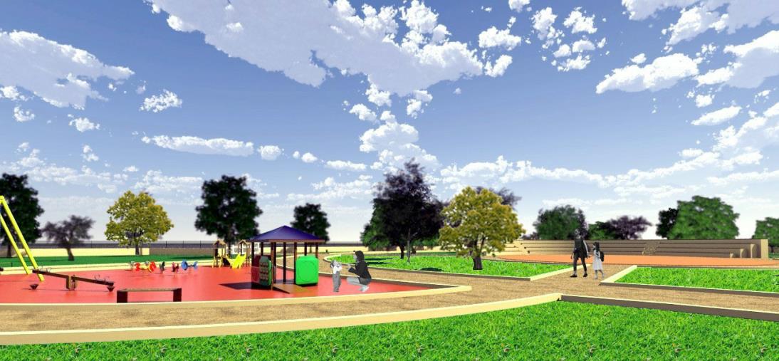 Gli interventi ricadenti in quest'area sono rispettivamente: la predisposizione di sottofondo esistente, tramite la rullatura della ghiaia presente, la posa di strato impermeabile, e di pavimentazione in materiale antitrauma; la realizzazione di muri di definizione delle aree gioco eseguiti in cls armato rivestito con ciottoli di fiume, ed installazione di attrezzature ludiche; l'installazione di gazebo in legno, con sedute in cls armato rivestito con ciottoli di fiume.