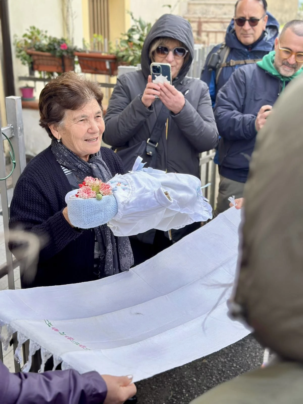 Il percorso è proseguito con la visita alla Chiesa del Carmine e con uno dei momenti più suggestivi della giornata: il racconto del Pupugheji, antico rito arbëresh di comparaggio narrato da Carmela Fazio, testimonianza viva di una cultura dove i legami sociali e simbolici erano – e in parte sono ancora – fondamentali.