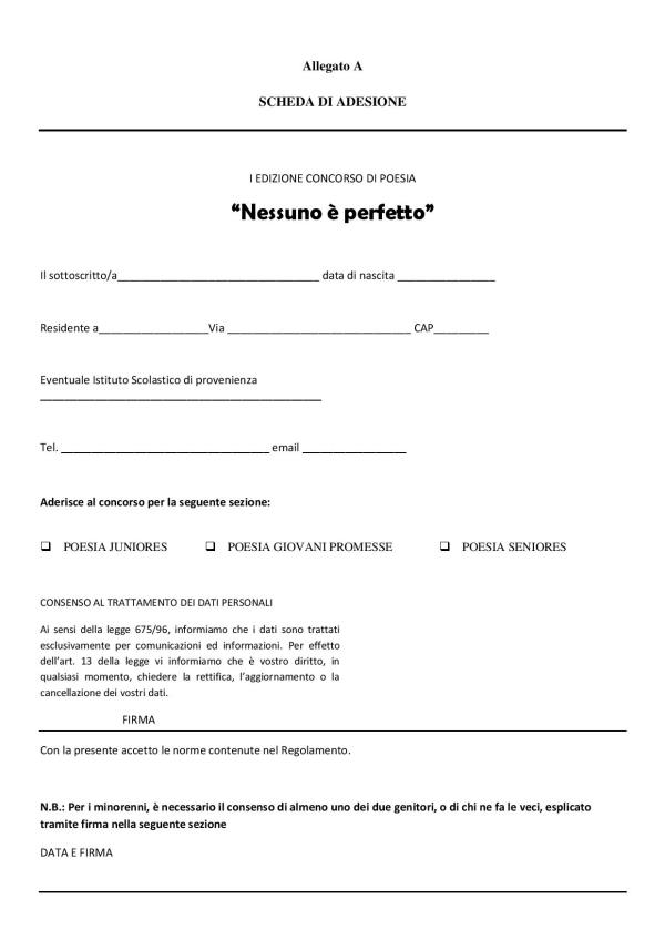 Si è voluto pertanto dedicare un ulteriore spazio a questo mondo spesso incompreso, ma dai valori più genuini. In linea con la miriade di iniziative svolte già nei mesi precedenti in tutta Italia e con l’intento di valorizzare soprattutto i talenti del luogo, che non sempre hanno le possibilità o le occasioni adeguate per mettersi in mostra, il concorso di poesia “Nessuno è perfetto” è indirizzato dunque a tutti, senza limiti di età, e in particolare agli studenti degli istituti cittadini e provinciali, che siano disposti a mettere in mostra il loro talento nell’ambito specifico della poesia.