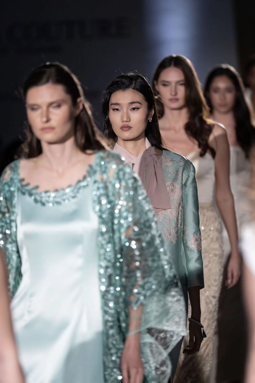 E allora abiti dai tagli minimal ma costruiti ad arte con linee chic, da tessuti pregiati come seta, broccati, georgette e duchesse, arricchiti da scintillanti ricami di perle, pietre e paillettes. Blu e bianchi nella sua palette cromatica per evocare i colori delle porcellane cinesi, spesso impreziosite dalla figura mitologica del drago, emblema della millenaria e straordinaria civiltà del Fiume Giallo.