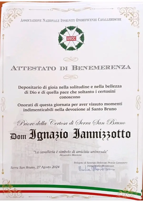 L’incontro col Priore è stato toccante ed ha riempito il cuore dei partecipanti con parole di incoraggiamento al mondo certosino. Padre Ignazio ha poi impartito una benedizione speciale a tutti i presenti e alle loro famiglie. Dopo una breve riflessione tra i partecipanti la delegazione si è spostata presso il ritrovo“Santa Maria” per un momento conviviale, nel quale sono stati consegnati gli attestati di partecipazione per questa giornata spirituale. Un giorno di grande spiritualità per tutti noi gentilmente accolti dal Rev.do Padre Ignazio Iannizzotto, al quale doverosamente esprimiamo i sensi della più viva gratitudine. All’ udienza erano altresì presenti: Presidente Nazionale A.I.C. associazione italiana dei cavalieri, Cav. Vincenzo Costa; Gran Priore Reggio Calabria Cavalieri Crociati guardiani di pace MALTA /ASSISI, Cav. Mariano Chirichimo, Sacro Militare Ordine Costantiniano di San Giorgio, Dama Michelina de Franco; Ordine di San Lazzaro di Gerusalemme, Commendatore Salvatore Barbieri e Cav. Vincenzo Loiero; Ordine di San Giorgio di Borgogna, Conte di Torre Spinosa e Barone di Badavecchia, Cav. Luca Perricelli; Patriarcato Ortodosso Orientale, Don Klaus Costa, Ordine Bizantino di Costantinopoli, S.E. Maria Gabriella Porpora Armao; Ordine di San Giorgio di Borgogna, Contessa di Sant’Addone, Dama Rita Parentela; Ordine Bizantino di Costantinopoli, Cav. Roberto Cilento.