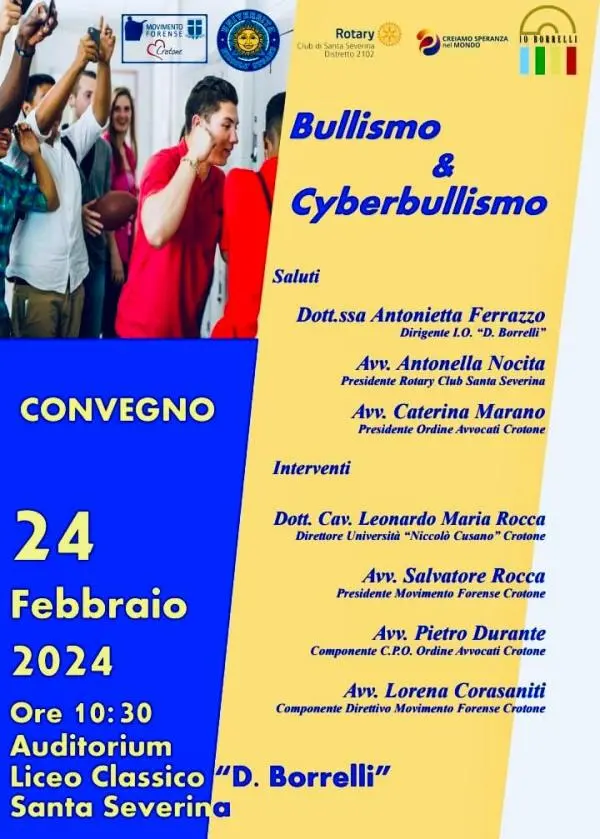 Sabato 24 febbraio 2024: incontro con i ragazzi del Liceo Classico “Diodato Borrelli” di Santa Severina per parlare di “bullismo” e di “cyberbullismo”, presso l’Auditorium dell’Istituto, Omnicomprensivo - Liceo Classico “Diodato Borrelli” di Santa Severina, è fissato l’incontro con le classi III, IV e V per riflettere sul tema del “bullismo” e del “cyberbullismo”.